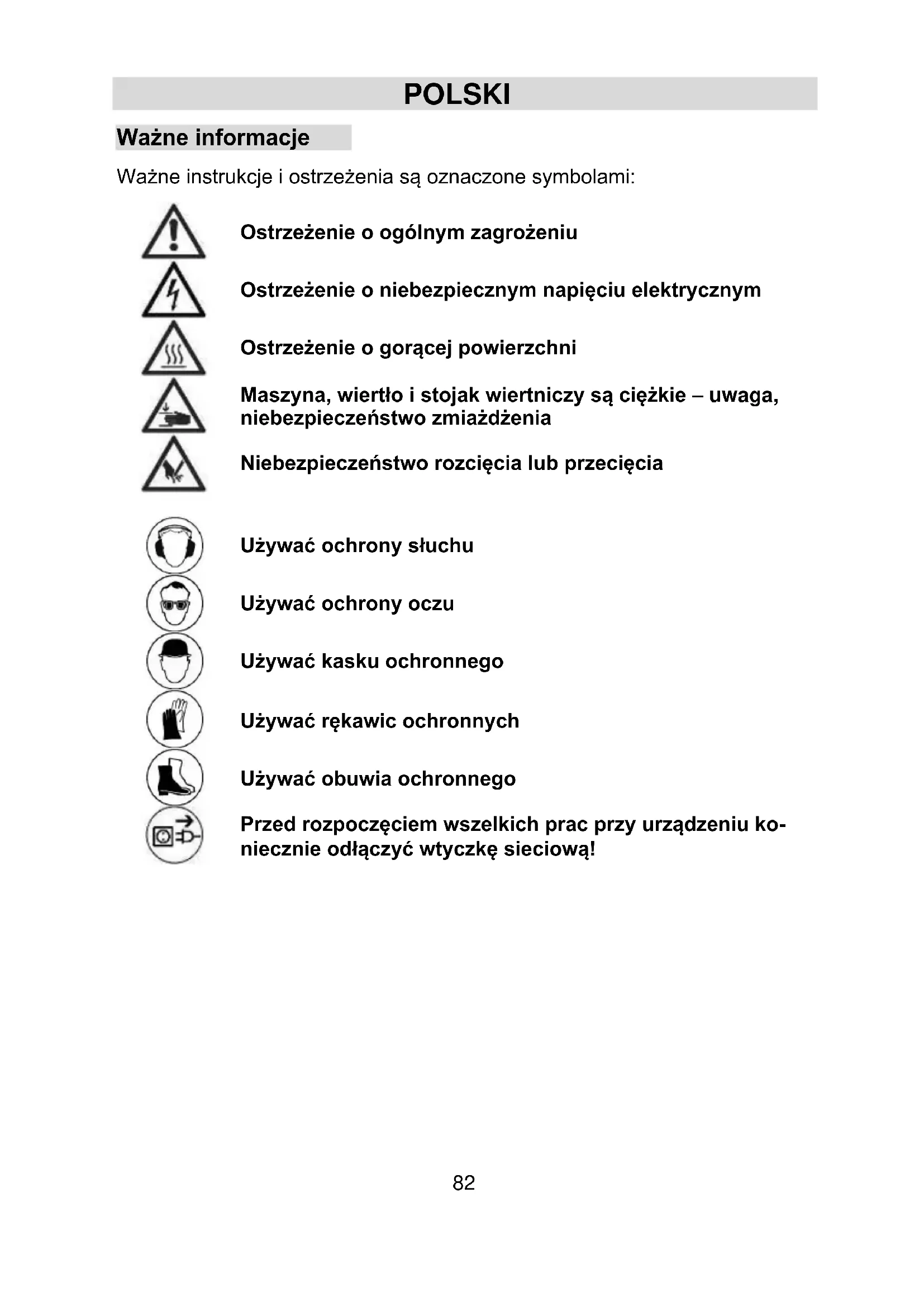 Podczas obsługi wiertarki rdzeniowej należy ściśle przestrzegać instrukcji obsługi i odpowiednich wska- zówek bezpieczeństwa!