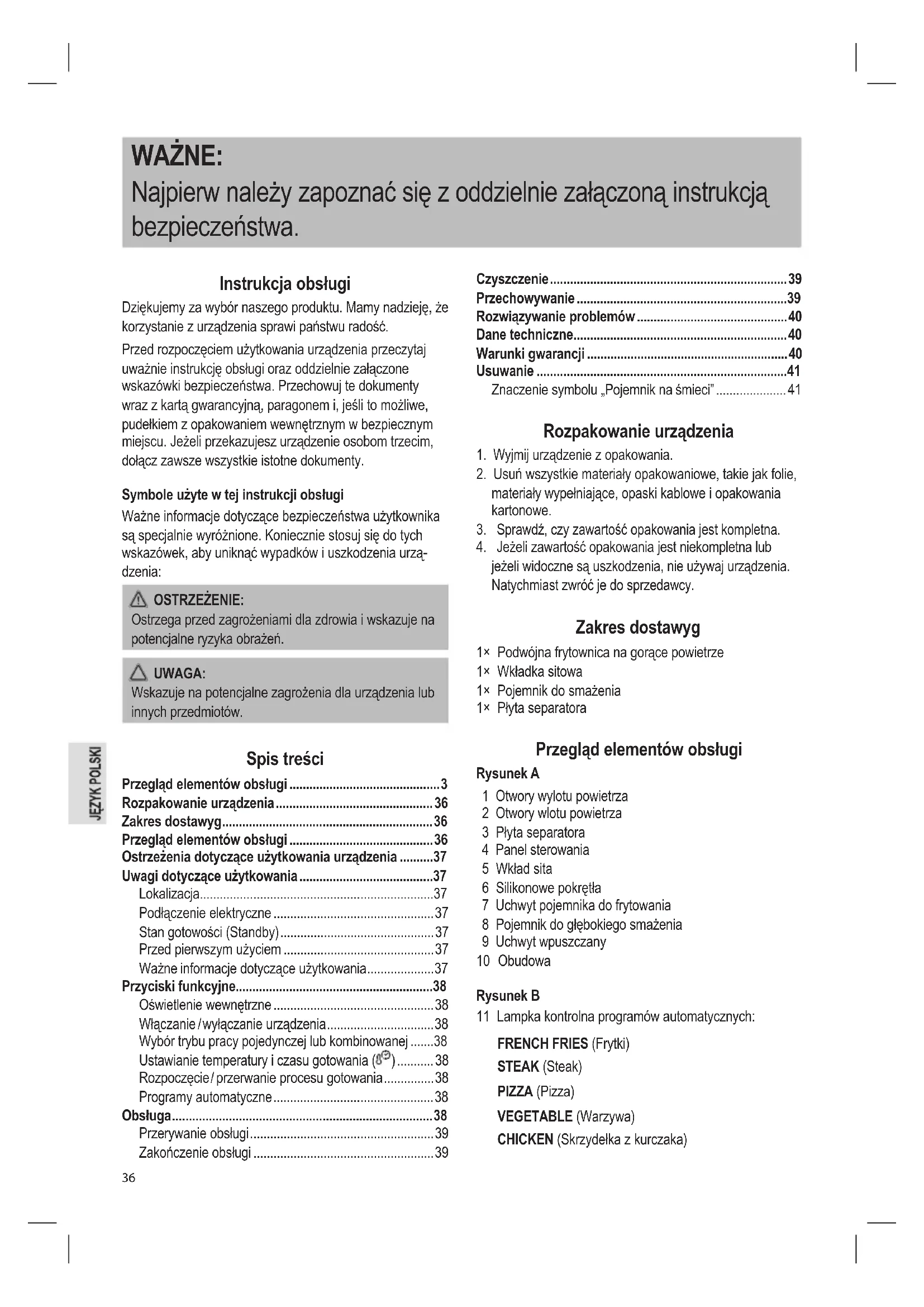 jeżeli widoczne są uszkodzenia, nie używaj urządzenia. Natychmiast zwróć je do sprzedawcy. Zakres dostawyg 1× Podwójna frytownica na gorące powietrze 1× Wkładka sitowa 1× Pojemnik do smażenia 1× Płyta separatora Przegląd elementów obsługi Rysunek A 1 Otwory wylotu powietrza 2 Otwory wlotu powietrza 3 Płyta separatora 4 Panel sterowania 5 Wkład sita 6 Silikonowe pokrętła 7 Uchwyt pojemnika do frytowania 8 Pojemnik do głębokiego smażenia 9 Uchwyt wpuszczany 10 Obudowa Rysunek B 11 Lampka kontrolna programów automatycznych: FRENCH FRIES (Frytki) STEAK (Steak) PIZZA (Pizza) VEGETABLE (Warzywa) CHICKEN (Skrzydełka z kurczaka)37 CAKE (Ciasto) BACON (Boczek) FISH (Ryba) SHRIMPS (Krewetki) KEEP WARM (Utrzymywać w cieple) 12 Panele sterowania dla komór frytownicy (komora