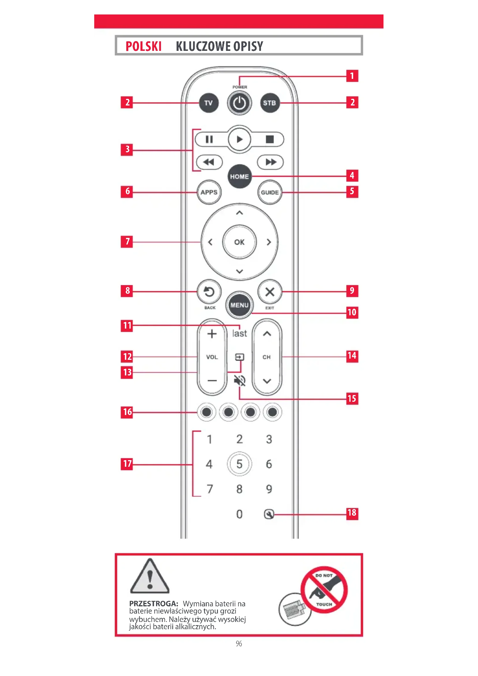 Przyciski wyboru urządzenia Te przyciski służą do wyboru urządzenia, które jest aktualnie sterowane za pomocą pilota EazyClean. Po naciśnięciu przycisku TV pilot będzie sterował telewizorem. Aby sterować innym urządzeniem, wystarczy nacisnąć odpowiedni przycisk. Dla każdego przycisku można zaprogramować następujące urządzenia: TV: wszystkie telewizory, takie jak LED, LCD, plazmowe, OLED itp. STB: dekodery, w tym satelitarne, kablowe i Freeview.