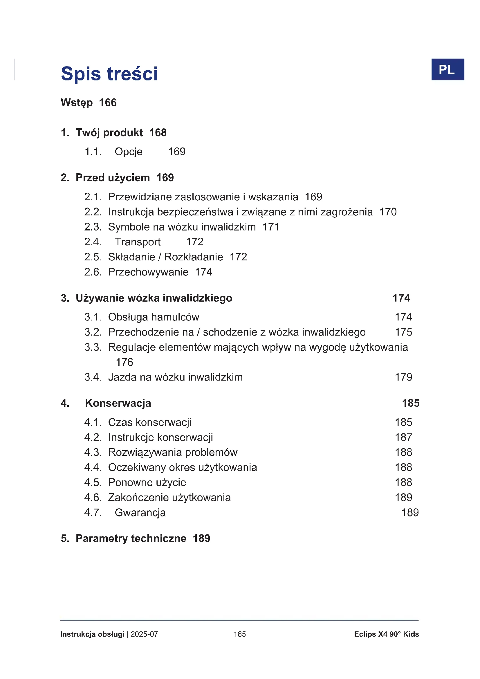 2.1. Przewidziane zastosowanie i wskazania 169 2.2. Instrukcja bezpieczeństwa i związane z nimi zagrożenia 170 2.3. Symbole na wózku inwalidzkim 171 2.4. Transport 172 2.5. Składanie / Rozkładanie 172 2.6. Przechowywanie 174