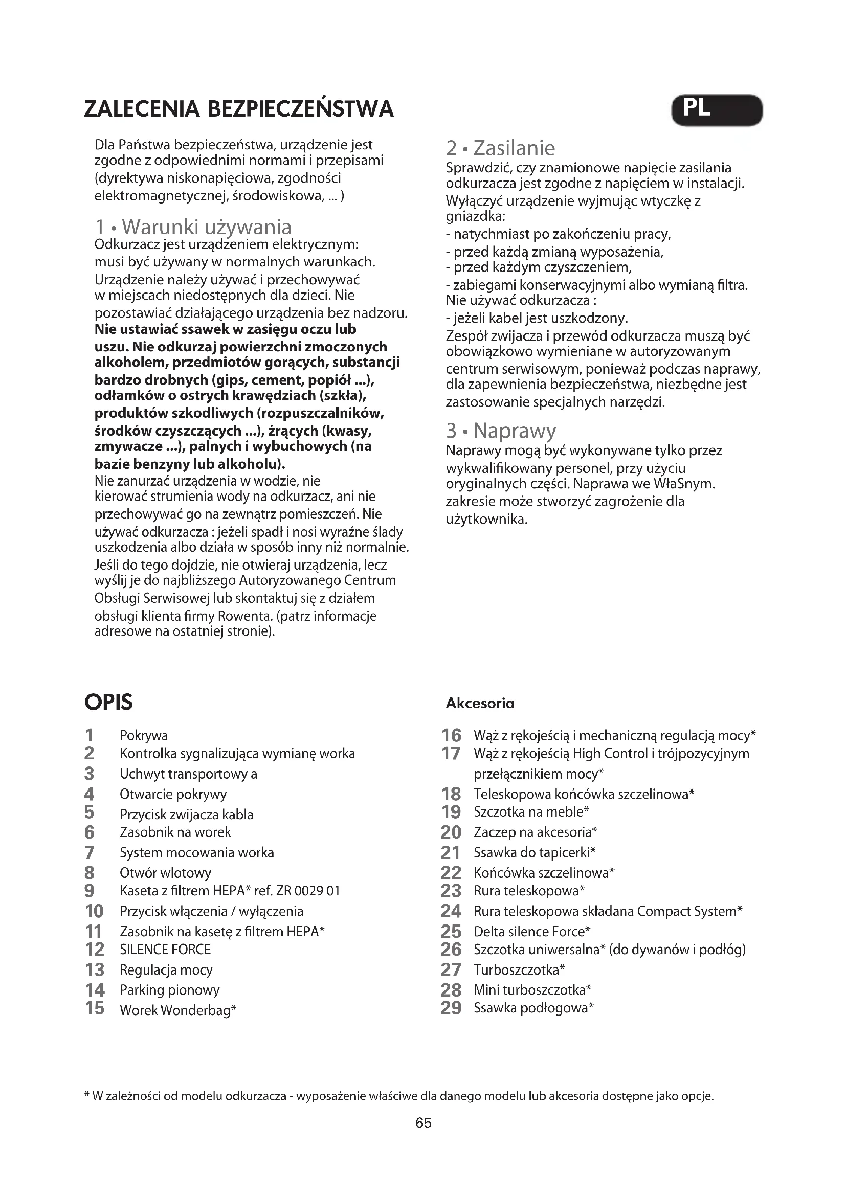 - Przed pierwszym użyciem urządzenia należy dokładnie zapoznać się z instrukcją. Rowenta nie ponosi odpowiedzialności w przypadku jakiegokolwiek użycia odkurzacza w sposób niezgodny z niniejszą instrukcją. PL69