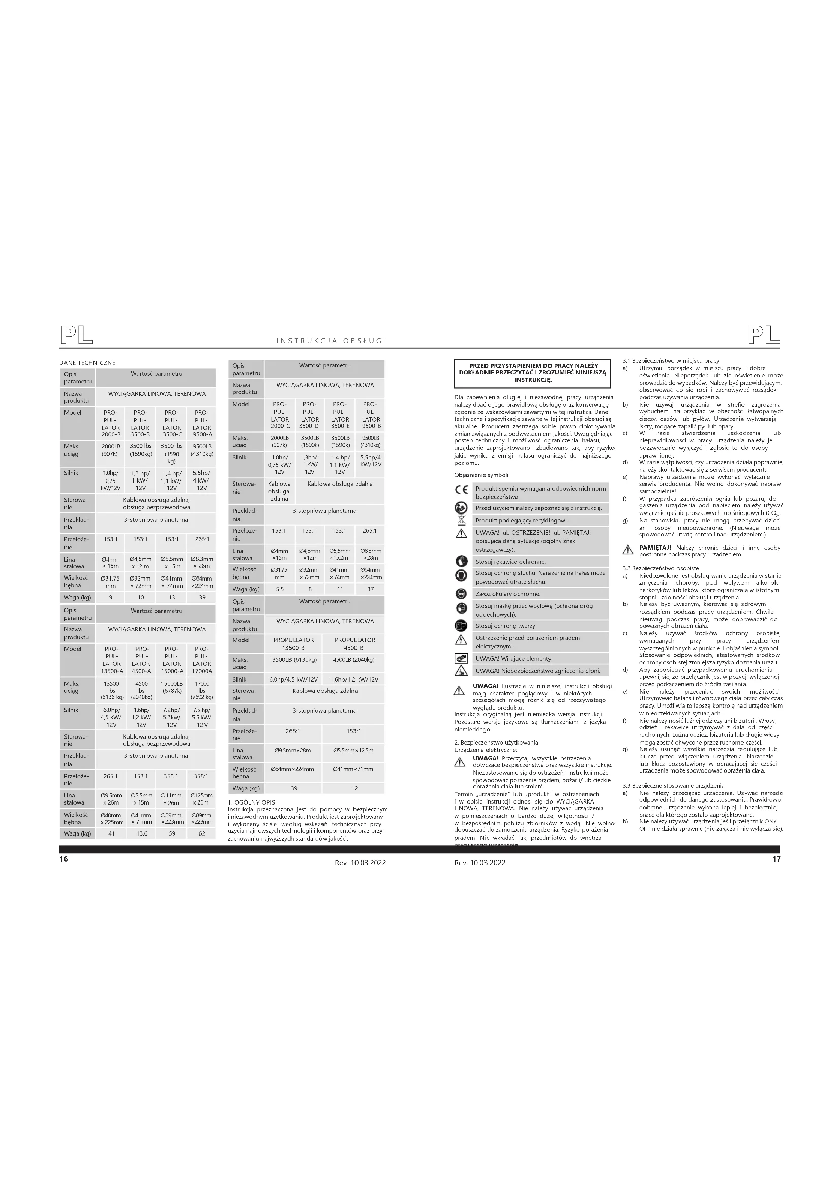 Model PRO- PUL- LATOR 2000-B PRO- PUL- LATOR 3500-B PRO- PUL- LATOR 3500-C PRO- PUL- LATOR 9500-A Maks. uciąg 2000LB (907k) 3500 lbs (1590kg) 3500 lbs (1590 kg) 9500LB (4310kg) Silnik 1.0hp/ 0,75 kW/12V 1,3 hp/ 1 kW/ 12V 1,4 hp/ 1,1 kW/ 12V 5.5hp/ 4 kW/ 12V Sterowa- nie Kablowa obsługa zdalna, obsługa bezprzewodowa Przekład- nia 3-stopniowa planetarna Przełoże- nie 153:1 153:1 153:1 265:1 Lina stalowa Ø4mm × 15m Ø4,8mm x 12 m Ø5,5mm x 15m Ø8,3mm × 28m Wielkość bębna Ø31.75