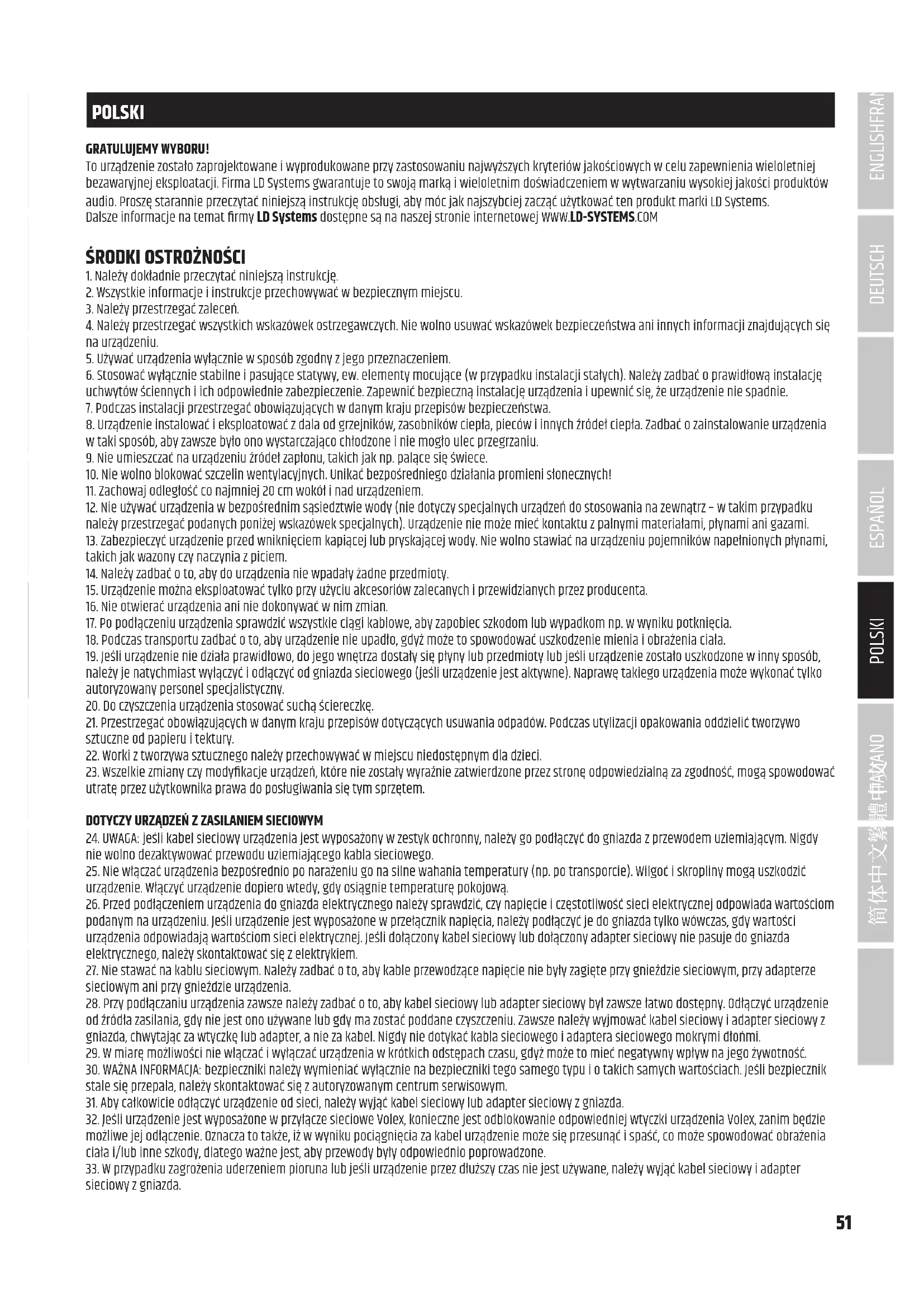 To urzadzenie zostalo zaprojektowane i wyprodukowane przy zastosowaniu najwyszych kryteriow jakosciywh w celu zapewnienia wieloletnej bezawaryjne eksploatacji. Firma LD Systems gwarantuje to swoja marka i wieloletnim doswiadczeniem w wytrarzniu wysokiej jakosci produktow audio. Prosze starannie przyczycyac niniejsza instrukcje oblugi, aby moc jak najszybciej zaczac uzytkowac ten produkt marki LD Systems. Dalsze informacja na temat firmy LD Systems dostepne są na naszej stronie internetowej WWW.LD-SYSTEMS.COM