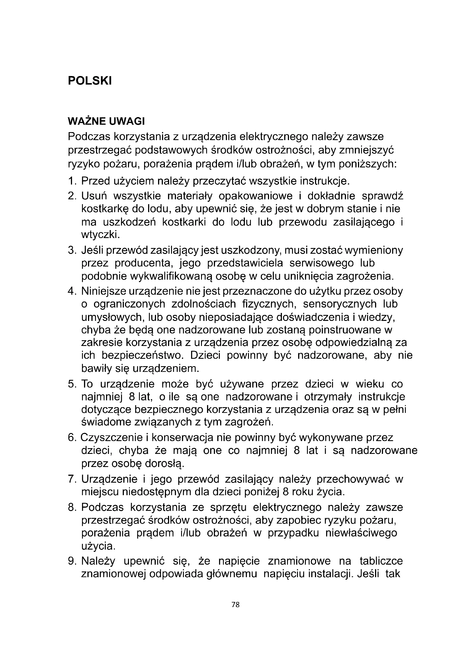 substancji wybuchowych, takich jak puszki aerozolowe z łatwopalnym gazem pędnym. -Ostrzeżenie: Otwory wentylacyjne w obudowie urządzenia lub w zabudowie powinny być wolne od przeszkód. -Ostrzeżenie: Nie należy używać urządzeń mechanicznych lub innych środków przyspieszających proces odszraniania, innych niż zalecane przez producenta. -Ostrzeżenie: Nie wolno uszkodzić obiegu czynnika chłodniczego.80 -Ostrzeżenie: Nie używaj urządzeń elektrycznych wewnątrz komory urządzenia do przechowywania żywności, chyba że są one typu zalecanego przez producenta. - Ostrzeżenie: Podczas ustawiania urządzenia należy upewnić się, że przewód zasilający nie jest przytrzaśnięty ani uszkodzony. - Ostrzeżenie: Nie należy umieszczać wielu przenośnych gniazdek elektrycznych lub przenośnych zasilaczy z tyłu urządzenia. - Ostrzeżenie: Urządzenie należy utylizować wyłącznie w autoryzowanym punkcie utylizacji odpadów. Nie wystawiać na działanie płomieni. - Ostrzeżenie: napełniać wyłącznie wodą pitną. - Ostrzeżenie: Podłączać wyłącznie do źródła wody pitnej. 17.Czynnik chłodniczy (R600a) jest łatwopalny. Uwaga: ryzyko pożaru / Materiały łatwopalne W obiegu czynnika chłodniczego urządzenia znajduje się izobuten (R600a), gaz ziemny o wysokim stopniu przyjazności dla środowiska, który jest jednak łatwopalny. Podczas transportu i instalacji urządzenia należy upewnić się, że żaden z elementów obiegu czynnika chłodniczego nie został uszkodzony. Jeśli obwód czynnika chłodniczego zostanie uszkodzony: - Unikać otwartego ognia i źródeł zapłonu. - Dokładnie przewietrz pomieszczenie, w którym znajduje się urządzenie. 18 Przed pierwszym użyciem kostkarki do lodu należy odczekać 2 godziny od jej ustawienia i pozostawić przezroczystą pokrywę otwartą przez co najmniej 2 godziny. 19.Czysta woda nie może być używana w tym urządzeniu, zalecana jest woda źródlana.81 20.Upewnij się, że napięcie jest zgodne z zakresem napięcia podanym na etykiecie znamionowej i upewnij się, że uziemienie gniazda jest w dobrym stanie. 21.Nie należy przechylać produktu ani nachylać go pod kątem większym niż 45°. 22.Aby uniknąć ryzyka porażenia prądem elektrycznym, nie wolno polewać wodą przewodu, wtyczki i wentylacji, ani zanurzać urządzenia w wodzie lub innym płynie. 23.Odłącz urządzenie po użyciu lub przed czyszczeniem.