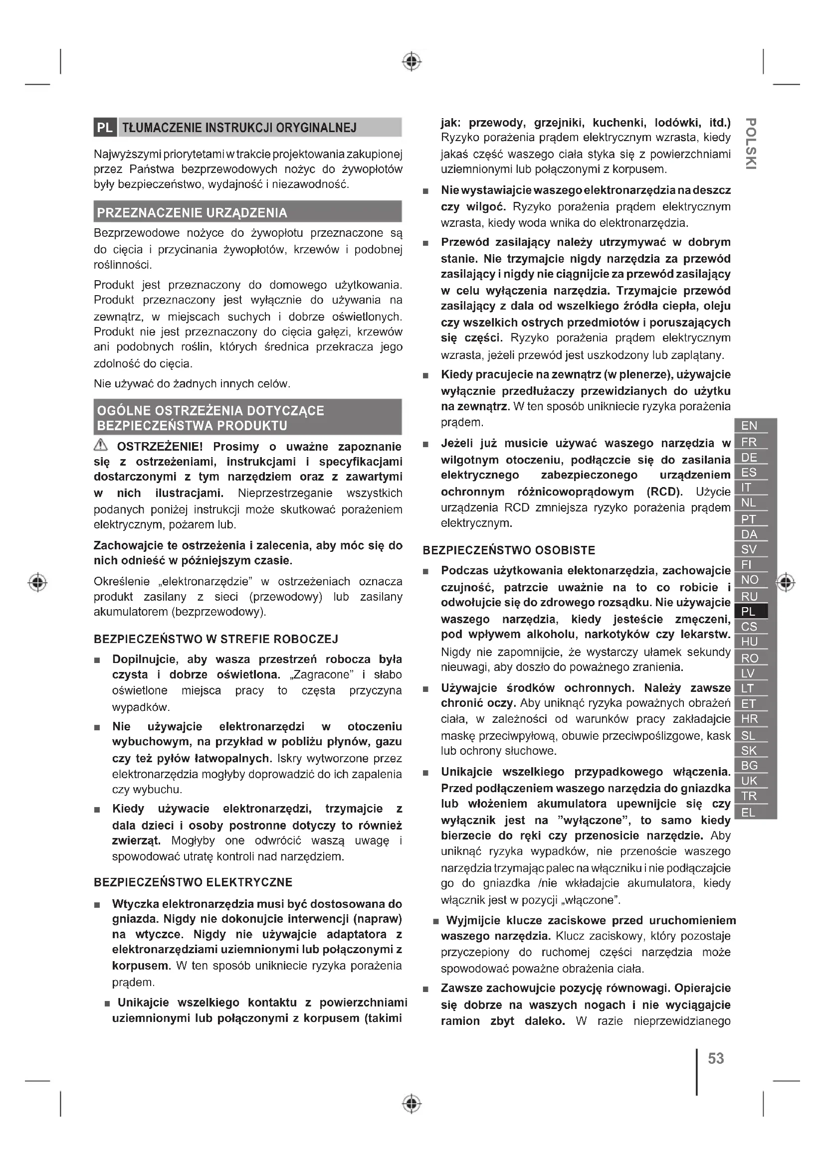 BEZPIECZEŃSTWA ■ Nie podejmować prób cięcia pni lub gałęzi o grubości przekraczającej głębokość cięcia podaną w tabeli z danymi technicznymi, a także pni lub gałęzi o rozmiarach wyraźnie zbyt dużych, by można je było wprowadzić do ostrza. Do docinania większych konarów należy używać piły ręcznej lub piły ogrodniczej. ■ Produkt zawsze należy obsługiwać, trzymając pewnie obiema rękoma oba uchwyty produktu. ■ Przed każdym użyciem należy sprawdzić maszynę. Należy sprawdzić, czy wszystkie przyrządy urządzenia działają prawidłowo. Sprawdzić, czy wszystkie mocowania są dobrze dokręcone oraz czy nie ma wycieków paliwa itp. Upewnić się, że wszystkie elementy zabezpieczające, osłony i uchwyty są prawidłowo i bezpiecznie zamocowane. Wymienić wszystkie uszkodzone elementy przed rozpoczęciem użytkowania. Sprawdzić, czy akumulator nie ma wycieków. ■ Sprawdzić żywopłoty i krzewy pod kątem obecności ukrytych przedmiotów, takich jak druciane ogrodzenia i ukryte przewody. ■ W trakcie obsługi produktu należy stać na gruncie, w przeciwieństwie do drabiny lub jakiegokolwiek innego niestabilnego podłoża. ■ Nie włączać produktu w miejscach źle oświetlonych. Produkt należy obsługiwać wyłącznie przy świetle dziennym lub przy odpowiednim sztucznym oświetleniu. Operator musi dobrze widzieć miejsce pracy, aby móc zidentyfikować potencjalne zagrożenia. ■ Stosowanie środków ochrony słuchu zmniejsza słyszalność ostrzeżeń (alarmów, okrzyków). Należy zwracać szczególną uwagę na potencjalne zagrożenia na obszarze pracy. Nie dopuszczać do rozproszenia uwagi. Zawsze skupiać się na wykonywanym zadaniu. ■ Aby ograniczyc ryzyko obrazen zwiazanych z kontaktem z czesciami w ruchu, zawsze wylaczac produkt i wyjmowac akumulator. Poczekać, aż zarówno produkt, jak i akumulator ostygną. Upewnić się, że wszystkie elementy ruchome zostały całkowicie zatrzymane: ● przed przystąpieniem do regulacji położenia roboczego noża ● przed serwisowaniem ● przed usunięciem zatoru ● przed sprawdzeniem, czyszczeniem i użytkowaniem produktu ● przed wymianą akcesoriów ● przed pozostawieniem produktu bez nadzoru ● przed rozpoczęciem kontroli pod kątem braku uszkodzeń po uderzeniu w obiekt lub przedmiot ● przed przystąpieniem do konserwacji ● jeśli produkt zacznie wibrować w nietypowy sposób ■ Nie wpychać produktu na siłę w gęsto zakrzewione obszary. Może to spowodować stępienie noży i56 zwolnienie ich pracy. Gdy noże zwalniają, zmniejszyć prędkość posuwu. ■ W przypadku upuszczenia produktu, narazenia jej na silne uderzenie lub w przypadku wystapienia nietypowych wibracji nalezy natychmiast zatrzymac produkt i sprawdzic, czy nie ma oznak uszkodzenia lub ustalic przyczyne wibracji. Każdą uszkodzoną część należy odpowiednio naprawić lub wymienić w autoryzowanym punkcie serwisowym. ■ Produkt nalezy stosowac tylko w temperaturach od 0 °C do 40 °C. ■ Produkt nalezy przechowywac w miejscu, w którym temperatura otoczenia wynosi od 0 °C do 40 °C. ■ Długotrwałe użytkowanie narzędzia może spowodować obrażenia ciała lub nasilić dolegliwości zdrowotne. W przypadku długotrwałego użytkowania jakiegokolwiek produktu należy robić regularne przerwy.