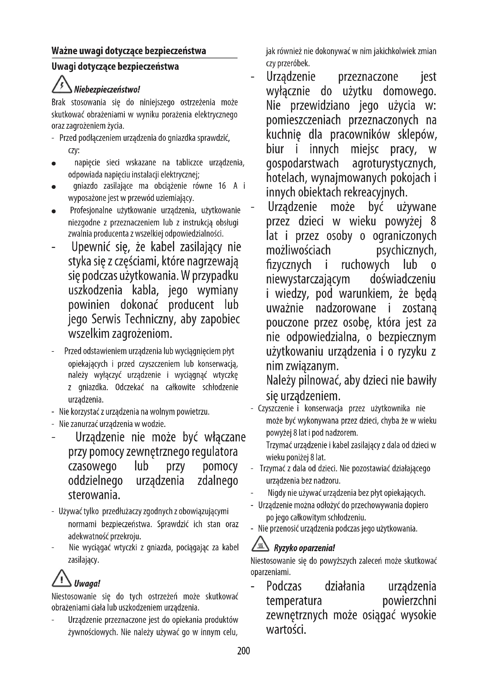 VOHVELILEVYSARJALISÄVARUSTE PERINTEISET VOHVELIT AINEKSET SEURAAVALLE MÄÄRÄLLE: 8 vohvelia VALMISTUS: 10 min KYPSENNYSAIKA: 10 min AINESOSAT: - 2 kuppia jauhoja / 460 g - 1 tl suolaa - 4 tl leivinjauhetta / 10 g - 2 rkl valkoista sokeria / 30 g - 2 munaa - 1 1/5 kuppia lämmintä maitoa / 345 ml - 75 g sulatettua voita - 1 tl vaniljauutetta VALMISTUS: Sekoita tilavassa kulhossa jauhot, suola, leivinjauhe ja sokeri sekä laita odottamaan. Vatkaa munat toisessa kulhossa sekä lisää maito, voi ja vanilja. Kaada jauhot ja muuta aineet kulhoon, jossa on maito ja munat, sekä sekoita hyvin vispilällä. Esilämmitä vohvelilevy. Kun näytölle ilmestyy kirjoitus READY, voitele levy tai käytä tarttumatonta suihketta, kaada sitten mitta-astiallinen kuhunkin muottiin levyssä käyttäen tarvittaessa apuna lusikkaa. Levitä taikinaa lastalla. Kypsennä vohveleita, kunnes ne ruskistuvat ja tulevat rapeiksi (noin 5 min). Jatka, kunnes taikina loppuu. Tarjoa välittömästi. BELGIALAISET VOHVELIT AINEKSET SEURAAVALLE MÄÄRÄLLE: 10-12 vohvelia VALMISTUS: 15min KYPSENNYSAIKA: 15min AINESOSAT: - 2 kuppia kakkujauhoja / 460 g - 1/2 tl suolaa - 2 tl leivinjauhetta / 5 g - 2 rkl valkoista sokeria / 30 g - 4 munaa - 2 kuppia lämmintä maitoa / 460 g - 70 g sulatettua voita - 1/2 tl vaniljauutetta VALMISTUS: Sekoita tilavassa kulhossa jauhot, suola ja leivinjauhe sekä laita odottamaan. Toisessa kulhossa sekoita munankeltuaisia ja sokeria, kunnes saat vaahtomaisen seoksen. Lisää vaniljauute, sulatettu voi sekä maito muniin ja sekoita vispilällä. Yhdistä kahden kulhon sisällöt ja sekoita vispilällä. Älä sekoita liian voimakkaasti. Kolmannessa kulhossa sekoita munanvalkuaiset vaahdoksi sähkövispilällä noin 1-2 minuuttia. Kumilastalla sekoita varovasti munanvalkuaiset vohvelitaikinaan. Älä sekoita liian voimakkaasti. Esilämmitä vohvelilevy. Kun näytölle ilmestyy kirjoitus READY, voitele levy tai käytä tarttumatonta suihketta, kaada sitten mitta- astiallinen kuhunkin muottiin levyssä käyttäen tarvittaessa apuna lusikkaa. Levitä taikinaa lastalla. Kypsennä vohveleita, kunnes ne ruskistuvat ja tulevat rapeiksi (noin 5 min). Jatka, kunnes taikina loppuu. Tarjoa välittömästi. SUKLAAKANELIVOHVELIT AINEKSET SEURAAVALLE MÄÄRÄLLE: 8-10 vohvelia VALMISTUS: 10 min KYPSENNYSAIKA: 15min AINESOSAT: - 2 kuppia jauhoja / 460 g - 1 tl suolaa - 1 tl leivinjauhetta / 3 g - 170 g sokeria - 2 munaa - 1 1/5 kuppia lämmintä maitoa / 345 ml - 80 g voita - 1 tl vaniljauutetta - 140 g tummaa suklaata - 60 g kaakaojauhetta - 6 g kanelia VALMISTUS: Aseta suklaa ja voi kulhoon, joka voidaan laittaa mikroaaltouuniin, ja lämmitä niitä maksimiteholla 30 sekuntia. Sekoita, kunnes suklaa ja voi sulavat kokonaan ja seos on tasaista. Anna jäähtyä hieman. Sekoita vispilällä munat, maito ja vanilja tilavassa kulhossa sekä lisää sitten huolellisesti voi-suklaaseos. Siivilöi jauhot, sokeri, kaakaojauhe, kaneli, leivinjauhe ja suola yhteen tilavassa kulhossa. Lisää jauhoseos ja muuta ainesosat muniin sekä sekoita hyvin vispilällä, kunnes seos on riittävän tasainen. Esilämmitä vohvelilevy. Kun näytölle ilmestyy kirjoitus READY, voitele levy tai käytä tarttumatonta suihketta, kaada sitten mitta-astiallinen kuhunkin muottiin levyssä käyttäen tarvittaessa apuna lusikkaa. Levitä taikinaa lastalla. Kypsennä vohveleita, kunnes ne ruskistuvat ja tulevat rapeiksi (noin 5 min). Jatka, kunnes taikina loppuu. Tarjoa välittömästi.200 Ważne uwagi dotyczące bezpieczeństwa Uwagi dotyczące bezpieczeństwa Niebezpieczeństwo! Brak stosowania się do niniejszego ostrzeżenia może skutkować obrażeniami w wyniku porażenia elektrycznego oraz zagrożeniem życia. - Przed podłączeniem urządzenia do gniazdka sprawdzić, czy: ● napięcie sieci wskazane na tabliczce urządzenia, odpowiada napięciu instalacji elektrycznej; ● gniazdo zasilające ma obciążenie równe 16 A i wyposażone jest w przewód uziemiający. ● Profesjonalne użytkowanie urządzenia, użytkowanie niezgodne z przeznaczeniem lub z instrukcją obsługi zwalnia producenta z wszelkiej odpowiedzialności. - Upewnić się, że kabel zasilający nie styka się z częściami, które nagrzewają się podczas użytkowania. W przypadku uszkodzenia kabla, jego wymiany powinien dokonać producent lub jego Serwis Techniczny, aby zapobiec wszelkim zagrożeniom. - Przed odstawieniem urządzenia lub wyciągnięciem płyt opiekających i przed czyszczeniem lub konserwacją, należy wyłączyć urządzenie i wyciągnąć wtyczkę z gniazdka. Odczekać na całkowite schłodzenie urządzenia. - Nie korzystać z urządzenia na wolnym powietrzu. - Nie zanurzać urządzenia w wodzie. - Urządzenie nie może być włączane przy pomocy zewnętrznego regulatora czasowego lub przy pomocy oddzielnego urządzenia zdalnego sterowania. - Używać tylko przedłużaczy zgodnych z obowiązującymi normami bezpieczeństwa. Sprawdzić ich stan oraz adekwatność przekroju. - Nie wyciągać wtyczki z gniazda, pociągając za kabel zasilający. Uwaga! Niestosowanie się do tych ostrzeżeń może skutkować obrażeniami ciała lub uszkodzeniem urządzenia. - Urządzenie przeznaczone jest do opiekania produktów żywnościowych. Nie należy używać go w innym celu, jak również nie dokonywać w nim jakichkolwiek zmian czy przeróbek. - Urządzenie przeznaczone jest wyłącznie do użytku domowego. Nie przewidziano jego użycia w: pomieszczeniach przeznaczonych na kuchnię dla pracowników sklepów, biur i innych miejsc pracy, w gospodarstwach agroturystycznych, hotelach, wynajmowanych pokojach i innych obiektach rekreacyjnych. - Urządzenie może być używane przez dzieci w wieku powyżej 8 lat i przez osoby o ograniczonych możliwościach psychicznych, zycznych i ruchowych lub o niewystarczającym doświadczeniu i wiedzy, pod warunkiem, że będą uważnie nadzorowane i zostaną pouczone przez osobę, która jest za nie odpowiedzialna, o bezpiec