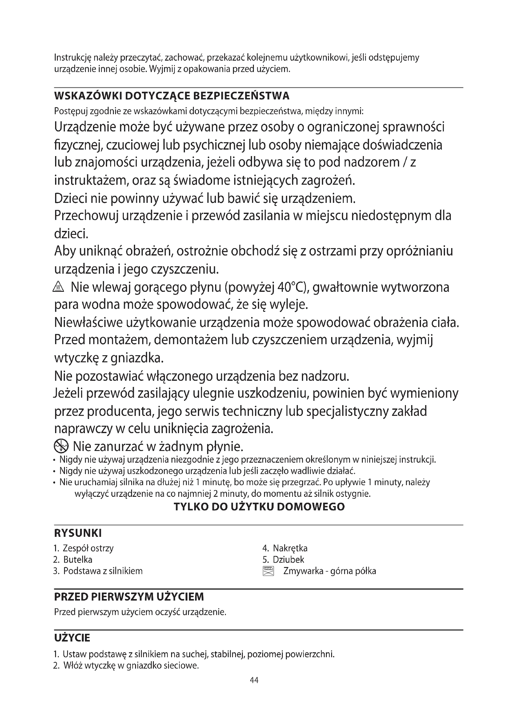 Postępuj zgodnie ze wskazówkami dotyczącymi bezpieczeństwa, między innymi: Urządzenie może być używane przez osoby o ograniczonej sprawności fizycznej, czuciowej lub psychicznej lub osoby niemające doświadczenia lub znajomości urządzenia, jeżeli odbywa się to pod nadzorem / z instruktażem, oraz są świadome istniejących zagrożeń. Dzieci nie powinny używać lub bawić się urządzeniem. Przechowuj urządzenie i przewód zasilania w miejscu niedostępnym dla dzieci. Aby uniknąć obrażeń, ostrożnie obchodź się z ostrzami przy opróżnianiu urządzenia i jego czyszczeniu. h Nie wlewaj gorącego płynu (powyżej 40°C), gwałtownie wytworzona para wodna może spowodować, że się wyleje. Niewłaściwe użytkowanie urządzenia może spowodować obrażenia ciała. Przed montażem, demontażem lub czyszczeniem urządzenia, wyjmij wtyczkę z gniazdka. Nie pozostawiać włączonego urządzenia bez nadzoru. Jeżeli przewód zasilający ulegnie uszkodzeniu, powinien być wymieniony przez producenta, jego serwis techniczny lub specjalistyczny zakład naprawczy w celu uniknięcia zagrożenia.