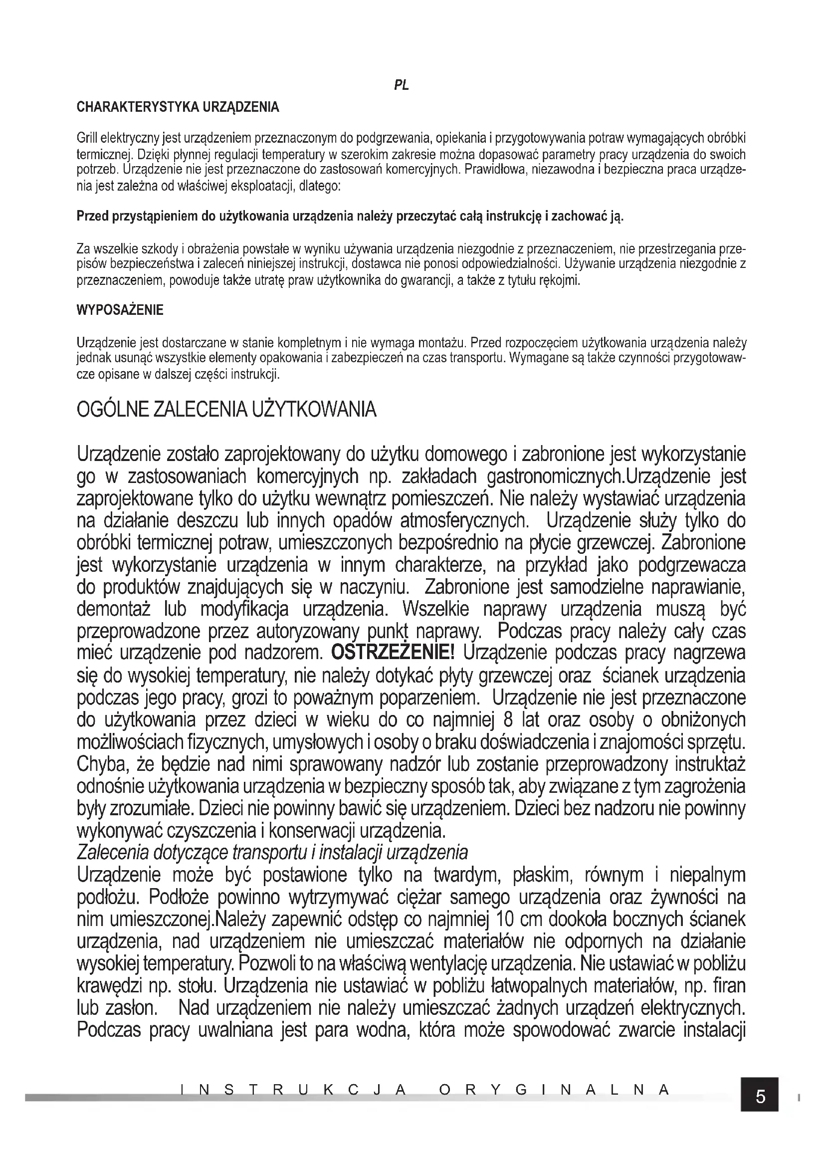Urządzenie zostało zaprojektowany do użytku domowego i zabronione jest wykorzystanie go w zastosowaniach komercyjnych np. zakładach gastronomicznych.Urządzenie jest zaprojektowane tylko do użytku wewnątrz pomieszczeń. Nie należy wystawiać urządzenia na działanie deszczu lub innych opadów atmosferycznych. Urządzenie służy tylko do obróbki termicznej potraw, umieszczonych bezpośrednio na płycie grzewczej. Zabronione jest wykorzystanie urządzenia w innym charakterze, na przykład jako podgrzewacza do produktów znajdujących się w naczyniu. Zabronione jest samodzielne naprawianie, demontaż lub modyfi kacja urządzenia. Wszelkie naprawy urządzenia muszą być przeprowadzone przez autoryzowany punkt naprawy. Podczas pracy należy cały czas mieć urządzenie pod nadzorem. OSTRZEŻENIE! Urządzenie podczas pracy nagrzewa się do wysokiej temperatury, nie należy dotykać płyty grzewczej oraz ścianek urządzenia podczas jego pracy, grozi to poważnym poparzeniem. Urządzenie nie jest przeznaczone do użytkowania przez dzieci w wieku do co najmniej 8 lat oraz osoby o obniżonych możliwościach fi zycznych, umysłowych i osoby o braku doświadczenia i znajomości sprzętu. Chyba, że będzie nad nimi sprawowany nadzór lub zostanie przeprowadzony instruktaż odnośnie użytkowania urządzenia w bezpieczny sposób tak, aby związane z tym zagrożenia były zrozumiałe. Dzieci nie powinny bawić się urządzeniem. Dzieci bez nadzoru nie powinny wykonywać czyszczenia i konserwacji urządzenia. Zalecenia dotyczące transportu i instalacji urządzenia Urządzenie może być postawione tylko na twardym, płaskim, równym i niepalnym podłożu. Podłoże powinno wytrzymywać ciężar samego urządzenia oraz żywności na nim umieszczonej.Należy zapewnić odstęp co najmniej 10 cm dookoła bocznych ścianek urządzenia, nad urządzeniem nie umieszczać materiałów nie odpornych na działanie wysokiej temperatury. Pozwoli to na właściwą wentylację urządzenia. Nie ustawiać w pobliżu krawędzi np. stołu. Urządzenia nie ustawiać w pobliżu łatwopalnych materiałów, np. fi ran lub zasłon. Nad urządzeniem nie należy umieszczać żadnych urządzeń elektrycznych. Podczas pracy uwalniana jest para wodna, która może spowodować zwarcie instalacjiINSTRUKCJA ORYGINALNA