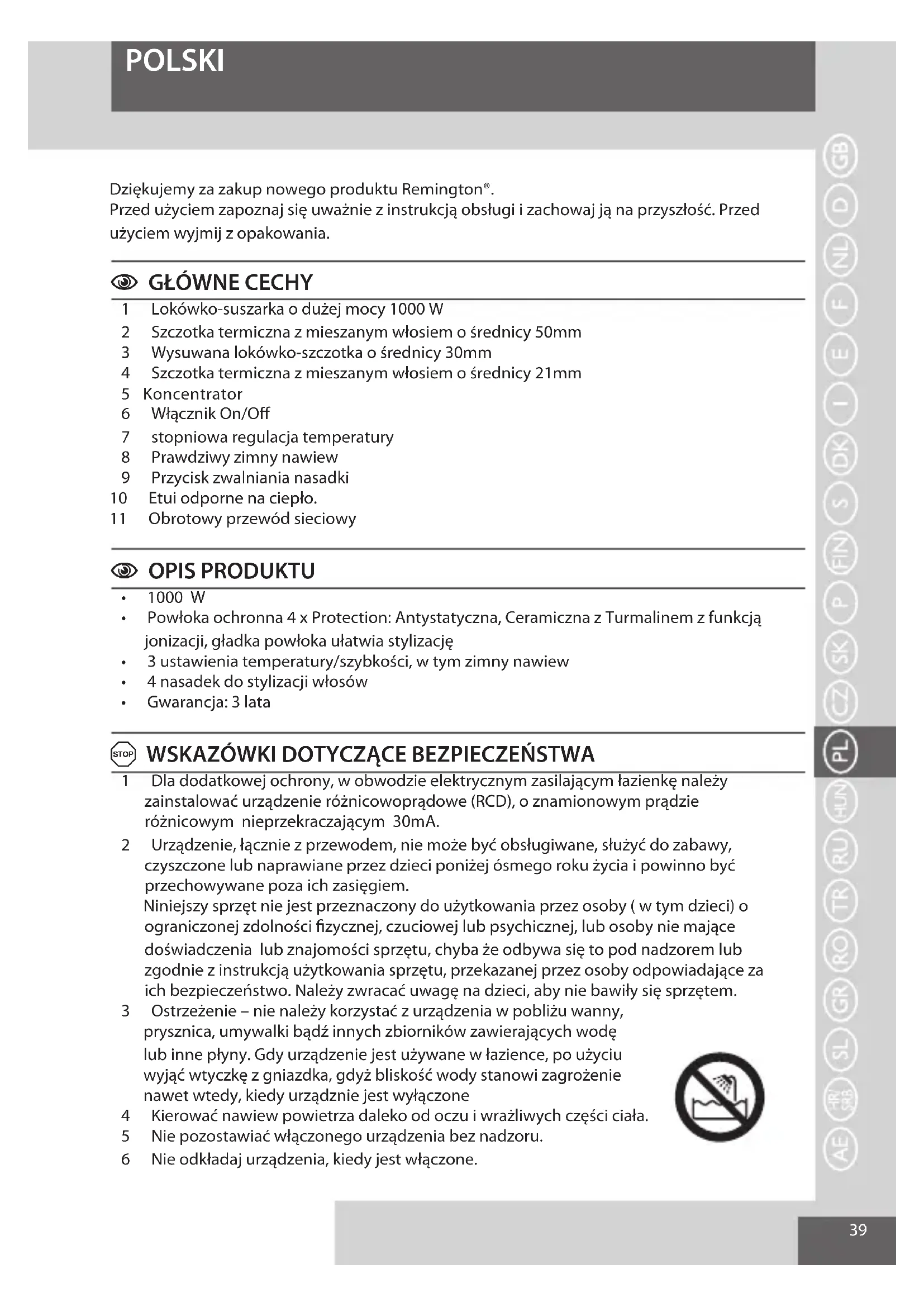 Niniejszyproduktzostałsprawdzonyijestwolnyodwad. Produktjestobjętygwarancjąobejmującąwszelkiewadymateriałoweiprodukcyjne.Okres obowiązywaniagwarancjirozpoczynasięoddatyzakupudokonanegoprzeznabywcę. Wokresieobowiązywaniagwarancjiwszelkiewadyurządzeniazostanąusuniętebezpłatnie, produktlubwadliwaczęśćzostanąnaprawionelubwymienionenawolneodwad,pod warunkiem okazania dowodu zakupu. Niestanowitojednakpodstawydowydłużeniaokresugwarancyjnego. Abyskorzystaćzgwarancjiwystarczyskontaktowaćsiętelefoniczniezlokalnympunktem serwisowym. Opróczniniejszejgwarancjinabywcyprzysługujązwykłeprawaustawowe. Gwarancjaobowiązujewewszystkichkrajach,wktórychproduktzostałzakupionyu autoryzowanegodystrybutoranaszejrmy. Niniejszagwarancjanieobejmujeprzypadkowychuszkodzeńproduktu,uszkodzeń wynikającychznieprawidłowegoużytkowanialubmodykacjiproduktu,lubużytkowania niezgodnegozinstrukcjąobsługii/lubwskazówkamibezpieczeństwa. Gwarancjatraciważnośćwprzypadkudemontażuinaprawdokonywanychprzezosoby nieuprawione. W kontakcie telefonicznym z punktem serwisowym prosimy o podanie numeru modelu urządzenia,beztegoniebędziemywstaniepomóc. Numerznajdujesięnatabliczceznamionowejnaurządzeniu. POLSKI42 MAGYAR Köszönjük,hogyegyújRemington®terméketvásárolt. Használatelőttgyelmesenolvassaeleztazútmutatótésőrizzemeg.Használatelőtt távolítsa el a csomagolást.