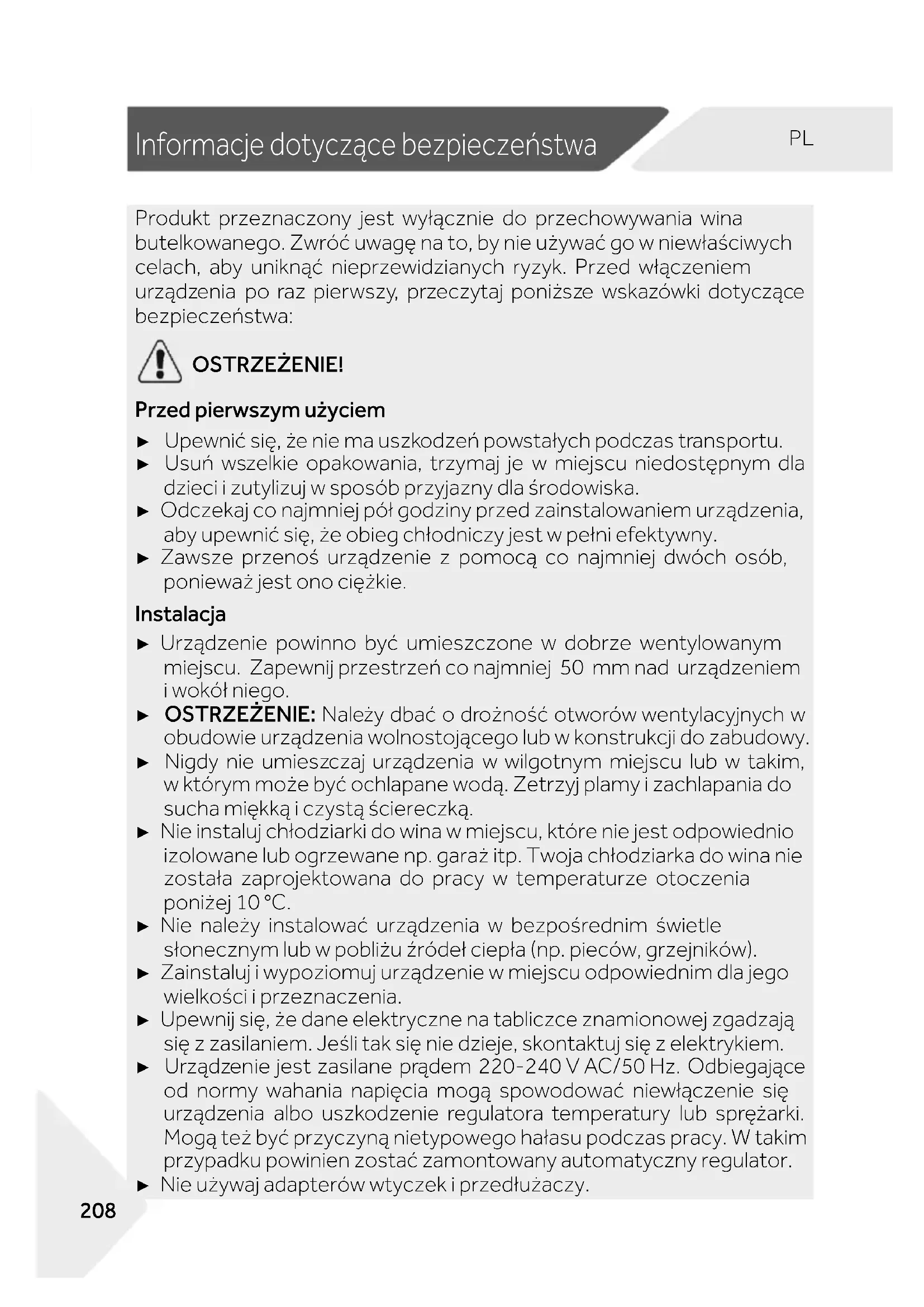 Produkt przeznaczony jest wyłącznie do przechowywania wina butelkowanego. Zwróć uwagę na to, by nie używać go w niewłaściwych celach, aby uniknąć nieprzewidzianych ryzyk. Przed włączeniem urządzenia po raz pierwszy, przeczytaj poniższe wskazówki dotyczące bezpieczeństwa: OSTRZEŻENIE! Przed pierwszym użyciem ► Upewnić się, że nie ma uszkodzeń powstałych podczas transportu. ► Usuń wszelkie opakowania, trzymaj je w miejscu niedostępnym dla dzieci i zutylizuj w sposób przyjazny dla środowiska. ► Odczekaj co najmniej pół godziny przed zainstalowaniem urządzenia, aby upewnić się, że obieg chłodniczy jest w pełni efektywny. ► Zawsze przenoś urządzenie z pomocą co najmniej dwóch osób, ponieważ jest ono ciężkie. Instalacja ► Urządzenie powinno być umieszczone w dobrze wentylowanym miejscu. Zapewnij przestrzeń co najmniej 50 mm nad urządzeniem i wokół niego. ► OSTRZEŻENIE: Należy dbać o drożność otworów wentylacyjnych w obudowie urządzenia wolnostojącego lub w konstrukcji do zabudowy. ► Nigdy nie umieszczaj urządzenia w wilgotnym miejscu lub w takim, w którym może być ochlapane wodą. Zetrzyj plamy i zachlapania do sucha miękką i czystą ściereczką. ► Nie instaluj chłodziarki do wina w miejscu, które nie jest odpowiednio izolowane lub ogrzewane np. garaż itp. Twoja chłodziarka do wina nie została zaprojektowana do pracy w temperaturze otoczenia poniżej 10 °C. ► Nie należy instalować urządzenia w bezpośrednim świetle słonecznym lub w pobliżu źródeł ciepła (np. pieców, grzejników). ► Zainstaluj i wypoziomuj urządzenie w miejscu odpowiednim dla jego wielkości i przeznaczenia. ► Upewnij się, że dane elektryczne na tabliczce znamionowej zgadzają się z zasilaniem. Jeśli tak się nie dzieje, skontaktuj się z elektrykiem. ► Urządzenie jest zasilane prądem 220-240 V AC/50 Hz. Odbiegające od normy wahania napięcia mogą spowodować niewłączenie się urządzenia albo uszkodzenie regulatora temperatury lub sprężarki. Mogą też być przyczyną nietypowego hałasu podczas pracy. W takim przypadku powinien zostać zamontowany automatyczny regulator. ► Nie używaj adapterów wtyczek i przedłużaczy.Informacje dotyczące bezpieczeństwa