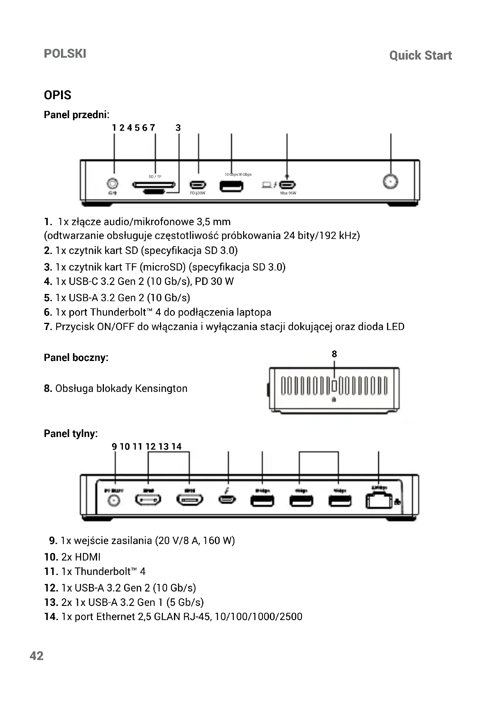Interfejs / port / złącze / wejście / gniazdo - miejsce, w którym dwa urządzenia są - zycznie połączone. Kontroler - element półprzewodnikowy (tzw. chipset) w notebooku / tablecie, zapewnia- jący działanie jednego z portów. Thunderbolt™ - to szybki interfejs sprzętowy, który umożliwia podłączanie urządzeń (peryferiów) do komputera za pośrednictwem magistrali rozszerzeń. Thunderbolt łączy PCI-Express i DisplayPort w szeregowy interfejs danych. Pozwala na podłączenie do 6 dodatkowych urządzeń Thunderbolt™, a prędkość transferu dla Thunderbolt™ 3/4 wynosi do 40Gbit/s. USB-C / USB Type-C / USB4 / Thunderbolt™ 3/4 - to symetryczne złącze umożliwia szyb- sze ładowanie, zasilanie, podwójną rolę (nie tylko hosta, ale także gościa), obsługę trybu Alt (DisplayPort, MHL, Thunderbolt 3, Power Delivery) i powiadamianie o błędach za po- mocą urządzenia Billboard. USB-C Power Delivery (USB-C PD) - opcjonalna funkcja złącza USB-C. Złącze z tą obsłu- gą może zarówno ładować, jak i być ładowanym, i obsługuje obciążenia od 10 W do 240 W USB 3.2 / 3.1 / 3.0 / 2.0 - standard interfejsu / portu USB do podłączania różnych urzą- dzeń USB. Do stacji dokującej lub adaptera można podłączyć różne urządzenia USB za pomocą interfejsu USB typu A. Port USB typu B służy do podłączenia stacji dokującej lub adaptera do laptopa/tabletu. HDMI/Display Port - standard cyfrowego interfejsu gracznego/portu używanego do podłączania monitorów i innych gracznych urządzeń wyświetlających. LAN (Local Area Network) - sieć lokalna, obecnie najpopularniejszy jest tzw. Ethernet, który osiąga teoretyczne prędkości transferu do 2,5 Gbit/s w stacji dokującej. Audio - termin oznaczający wejście audio (mikrofon) lub urządzenie wyjściowe (słuchaw- ki/głośniki).Quick Start
