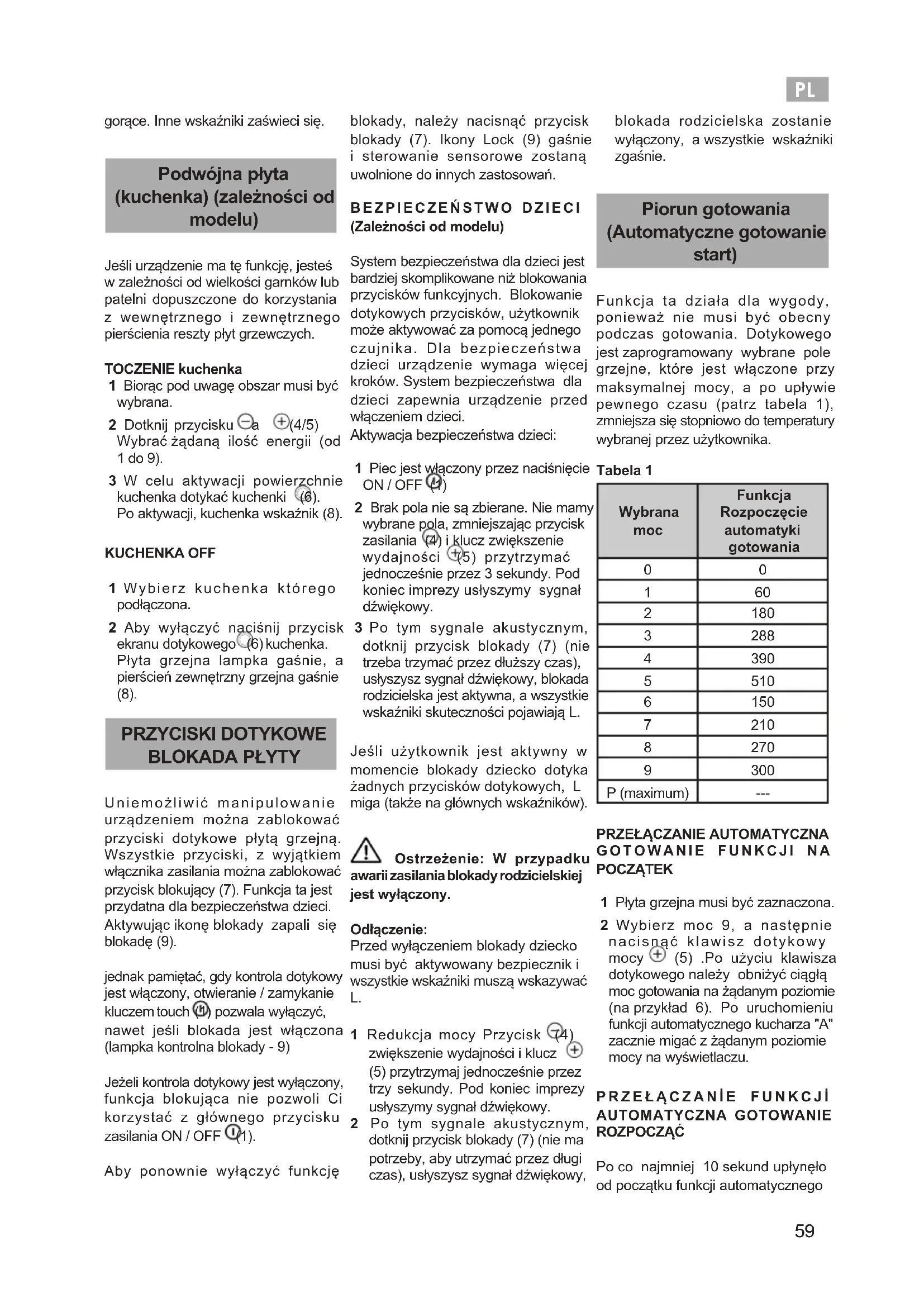 1 Redukcja mocy Przycisk (4) zwiększenie wydajności i klucz (5) przytrzymaj jednocześnie przez trzy sekundy. Pod koniec imprezy usłyszymy sygnał dźwiękowy. 2 Po tym sygnale akustycznym, dotknij przycisk blokady (7) (nie ma potrzeby, aby utrzymać przez długi czas), usłyszysz sygnał dźwiękowy, blokada rodzicielska zostanie wyłączony, a wszystkie wskaźniki zgaśnie. Piorun gotowania (Automatyczne gotowanie start) Funkcja ta działa dla wygody, ponieważ nie musi być obecny podczas gotowania. Dotykowego jest zaprogramowany wybrane pole grzejne, które jest włączone przy maksymalnej mocy, a po upływie pewnego czasu (patrz tabela 1), zmniejsza się stopniowo do temperatury wybranej przez użytkownika. Tabela 1 Wybrana moc Funkcja Rozpoczęcie automatyki gotowania
