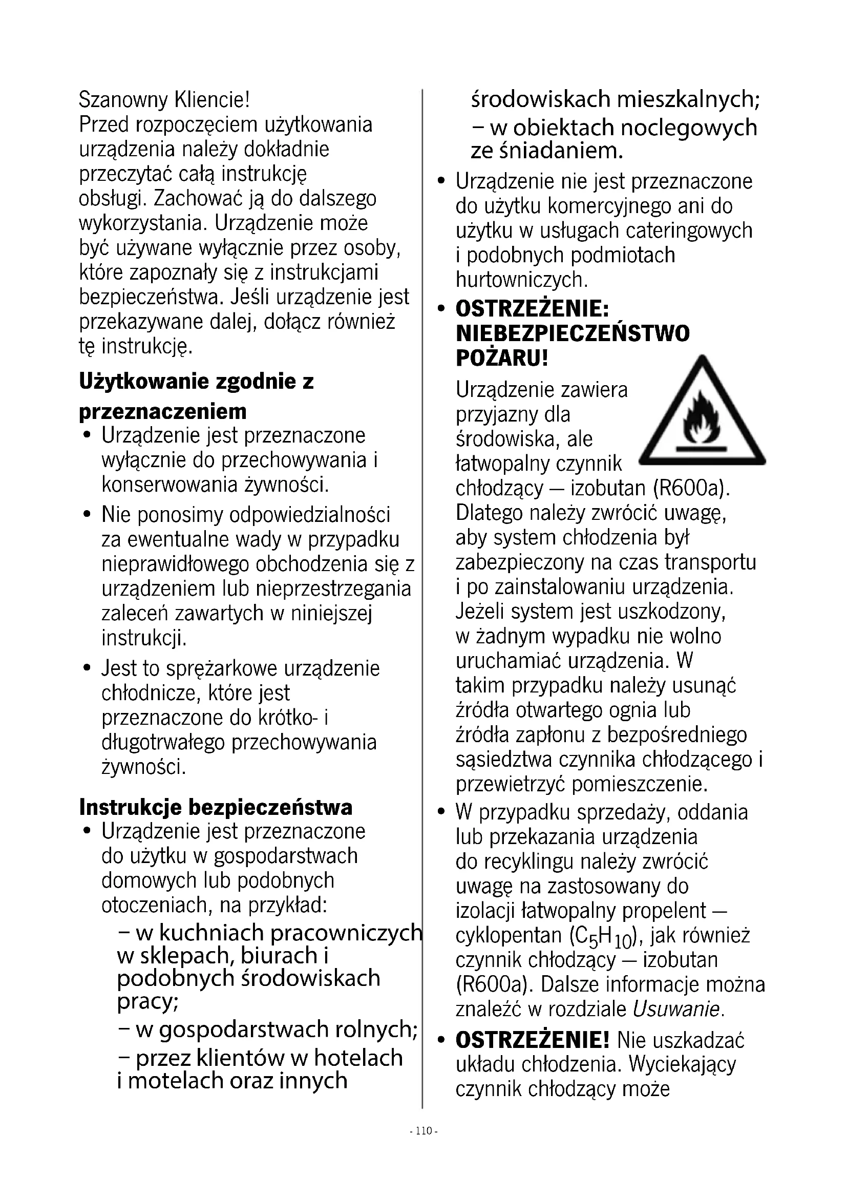 - OSTRZEŻENIE: NIEBEZPIECZEŃSTWO POŻARU! Urządzenie zawiera przyjazny dla środowiska, ale łatwopalny czynnik chłodzący — izobutan (R600a). Dlatego należy zwrócić uwagę, aby system chłodzenia był zabezpieczony na czas transportu i po zainstalowaniu urządzenia. Jeżeli system jest uszkodzony, w żadnym wypadku nie wolno uruchamiać urządzenia. W takim przypadku należy usunąć źródła otwartego ognia lub źródła zapłonu z bezpośredniego sąsiedztwa czynnika chłodzącego i przewietrzyć pomieszczenie.