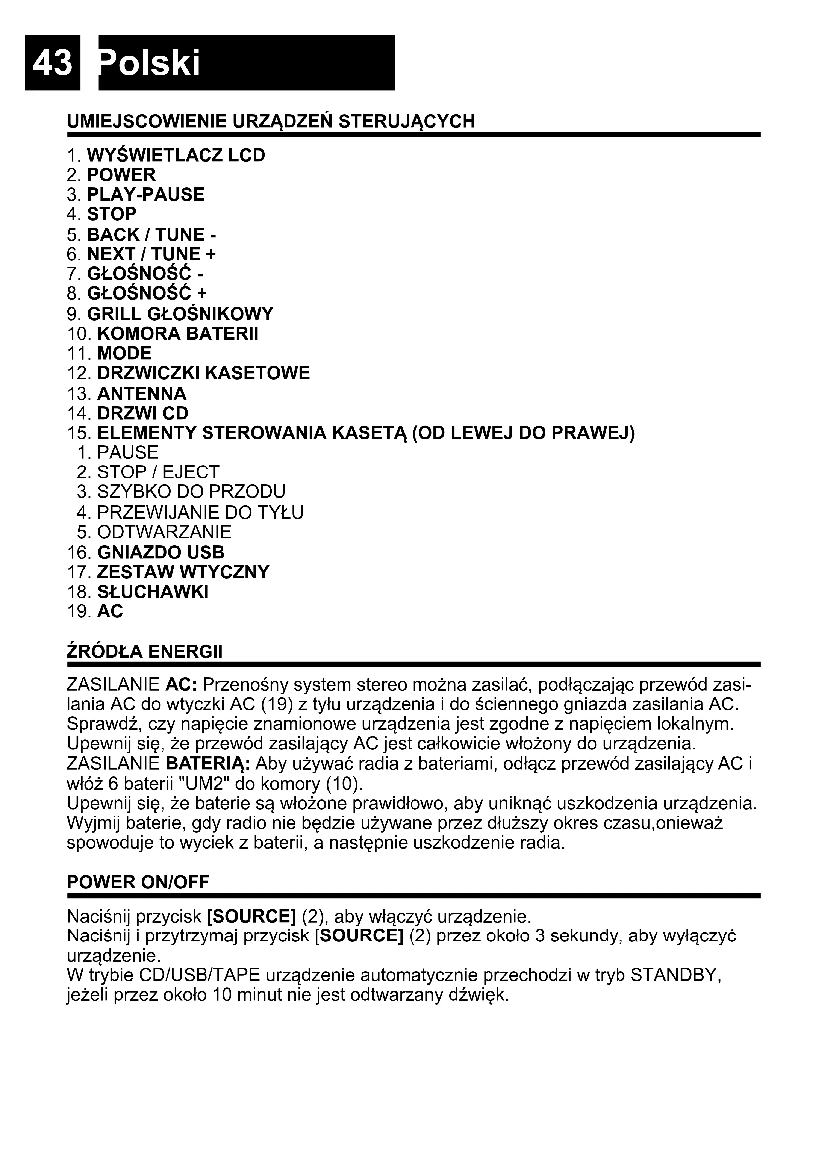 Naciśnij przycisk [SOURCE] (2), aby włączyć urządzenie. Naciśnij i przytrzymaj przycisk [SOURCE] (2) przez około 3 sekundy, aby wyłączyć urządzenie. W trybie CD/USB/TAPE urządzenie automatycznie przechodzi w tryb STANDBY, jeżeli przez około 10 minut nie jest odtwarzany dźwięk.44 Polski OSTROŻNIE - INSTRUKCJE - Wszystkie instrukcje dotyczące bezpieczeństwa i obsługi powinny być przeczytane przed rozpoczęciem użytkowania radiotelefonu. Instrukcja powinna być zachowana do wykorzystania w przyszłości. - ZASTOSUJ SIĘ DO OSTRZEŻEŃ - Należy przestrzegać wszystkich ostrzeżeń umieszczonych na urządzeniu oraz w instrukcji obsługi. - WODA I WILGOĆ - Urządzenie nie powinno być używane w pobliżu płynów lub w pomieszczeniach o wysokim poziomie wilgotności. - WENTYLACJA - Urządzenie powinno być ustawione tak, aby jego lokalizacja lub położenie nie przeszkadzało w prawidłowej wentylacji. - CIEPŁO - Urządzenie powinno być umieszczone z dala od źródeł ciepła, takich jak grzejniki, piece lub inne urządzenia wytwarzające ciepło. - ŹRÓDŁO ZASILANIA - Radioodbiornik powinien być podłączony do zasilania tylko takiego, które jest opisane w instrukcji obsługi lub oznaczone na urządzeniu. - OCHRONA PRZEWODÓW ZASILANIA - Przewody zasilające powinny być poprowad- zone w taki sposób, aby nie było możliwości nadepnięcia na nie lub przygniecenia przez przedmioty stawiane na nich lub naprzeciwko nich. - WSTĘP OBIEKTÓW I PŁYNÓW - Należy uważać, aby przedmioty nie spadły, a pły- ny nie przedostały się do obudowy przez otwory.