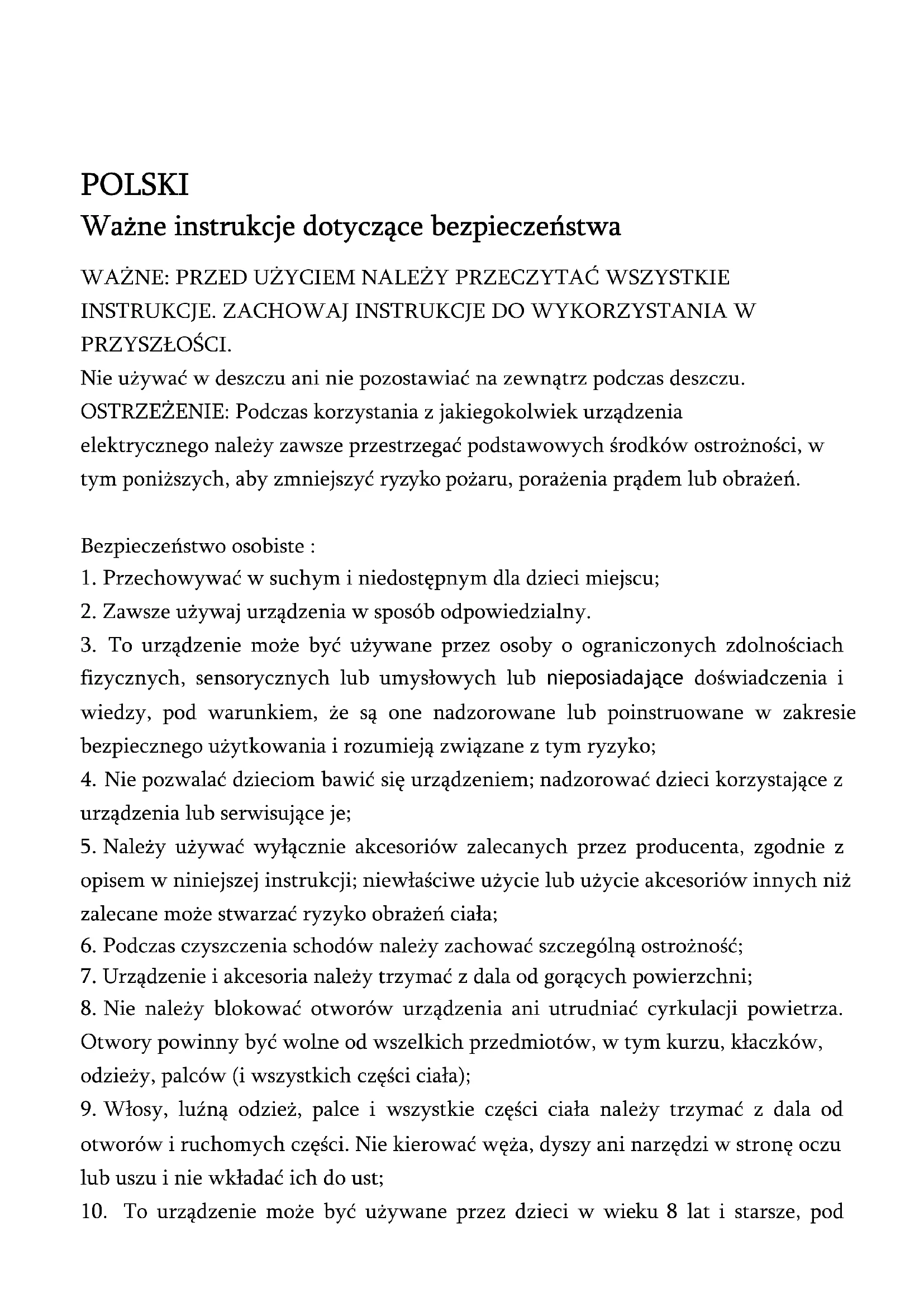 PRZYSZŁOŚCI. Nie używać w deszczu ani nie pozostawiać na zewnątrz podczas deszczu. OSTRZEŻENIE: Podczas korzystania z jakiegokolwiek urządzenia elektrycznego należy zawsze przestrzegać podstawowych środków ostrożności, w tym poniższych, aby zmniejszyć ryzyko pożaru, porażenia prądem lub obrażeń. Bezpieczeństwo osobiste :