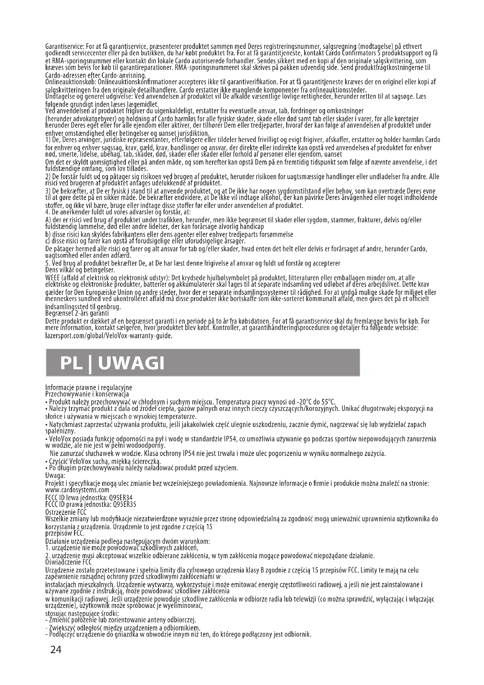a) istnieje ryzyko związane z używaniem produktu w ruchu drogowym, w tym, ale nie tylko, obrażenia lub choroby, naciągnięcia, złamania, częściowe i/lub całkowite porażenie, śmierć lub inne dolegliwości, które mogą powodować poważną niepełnosprawność; b) ryzyka te mogą być spowodowane zaniedbaniem producentów lub jego agentów lub jakiejkolwiek strony trzeciej zaangażowanej w produkt; c) ryzyka i niebezpieczeństwa te mogą wynikać z przyczyn przewidywalnych lub nieprzewidywalnych. Niniejszym przyjmujesz na siebie wszystkie ryzyka i niebezpieczeństwa oraz całą odpowiedzialność za wszelkie straty i/lub szkody, niezależnie od tego, czy są one spowodowane w całości lub w części zaniedbaniem lub innym działaniem innych osób, w tym Cardo. 5. Korzystając z produktu, potwierdzasz, że przeczytałeś to zwolnienie z odpowiedzialności i w pełni rozumiesz i akceptujesz jego warunki. WEEE (Zużyty sprzęt elektryczny i elektroniczny): Symbol przekreślonego kosza na śmieci na produkcie, w dokumentacji lub na opakowaniu przypomina, że wszystkie elektryczne i elektroniczne produkty, baterie i akumulatory muszą być poddane oddzielnej zbiórce po zakończeniu ich okresu użytkowania. Wymóg ten obowiązuje w Unii Europejskiej i innych miejscach, gdzie dostępne są systemy oddzielnej zbiórki. Aby zapobiec potencjalnym szkodom dla środowiska lub zdrowia ludzkiego wynikającym z niekontrolowanej utylizacji odpadów, nie wyrzucaj tych produktów jako niesegregowanych odpadów komunalnych, lecz oddaj je w oficjalnym punkcie zbiórki w celu recyklingu. Ograniczona 2-letnia gwarancja Produkt ten jest objęty ograniczoną gwarancją na okres dwóch lat od daty zakupu. Aby uzyskać usługę gwarancyjną, musisz przedstawić dowód zakupu. Aby uzyskać więcej informacji, skontaktuj się ze sprzedawcą, w którym produkt został zakupiony. Sprawdź procedurę obsługi gwarancji i szczegóły z następującej strony internetowej: lazersport.com/global/VeloVox-warranty-guide. Regulační a právní informace Skladování a údržba