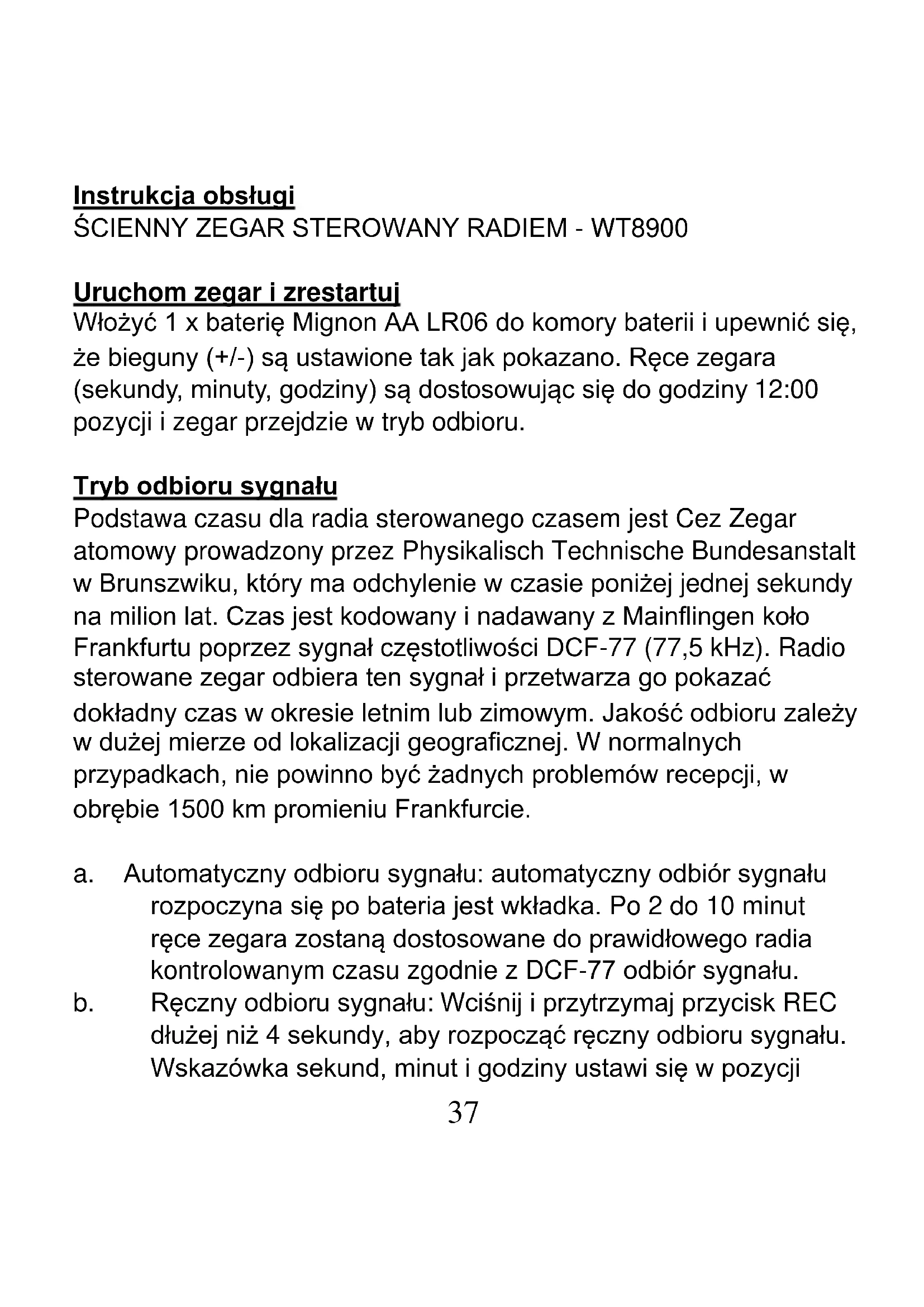 Uruchom zegar i zrestartuj Włożyć 1 x baterię Mignon AA LR06 do komory baterii i upewnić się, że bieguny (+/-) są ustawione tak jak pokazano. Ręce zegara (sekundy, minuty, godziny) są dostosowując się do godziny 12:00 pozycji i zegar przejdzie w tryb odbioru. Tryb odbioru sygnału Podstawa czasu dla radia sterowanego czasem jest Cez Zegar atomowy prowadzony przez Physikalisch Technische Bundesanstalt w Brunszwiku, który ma odchylenie w czasie poniżej jednej sekundy na milion lat. Czas jest kodowany i nadawany z Mainflingen koło Frankfurtu poprzez sygnał częstotliwości DCF-77 (77,5 kHz). Radio sterowane zegar odbiera ten sygnał i przetwarza go pokazać dokładny czas w okresie letnim lub zimowym. Jakość odbioru zależy w dużej mierze od lokalizacji geograficznej. W normalnych przypadkach, nie powinno być żadnych problemów recepcji, w obrębie 1500 km promieniu Frankfurcie. a. Automatyczny odbioru sygnału: automatyczny odbiór sygnału rozpoczyna się po bateria jest wkładka. Po 2 do 10 minut ręce zegara zostaną dostosowane do prawidłowego radia kontrolowanym czasu zgodnie z DCF-77 odbiór sygnału. b. Ręczny odbioru sygnału: Wciśnij i przytrzymaj przycisk REC dłużej niż 4 sekundy, aby rozpocząć ręczny odbioru sygnału. Wskazówka sekund, minut i godziny ustawi się w pozycji38 godziny 12 oraz nastąpi przejście do trybu odbioru sygnału. Jeśli sygnał jest pomyślnie odebrane, ręce zegara zostaną automatycznie dostosowane do prawidłowego radia kontrolowanym czasu. Procedura ta trwa około 2 do 10 minut. Jeśli odbiór sygnału nie powiodła się, zegar nadal działa od oryginalnego czasu. W późniejszym udanym odbioru sygnału, czasu zostaną dostosowane do prawidłowego radia kontrolowanym czasu zgodnie z DCF-77 odbiór sygnału. Środowiskowe efekty odbioru Zegar pobiera dokładny czas za pomocą technologii bezprzewodowej. Tak jak we wszystkich urządzeniach bezprzewodowych, odbiór może być zakłócany przez następujące okoliczności: duża odległość przekazu góry i doliny pobliżu bliskość autostrad, linii kolejowych, lotnisk, linii wysokiego napięcia, itd. bliskość budów wzdłuż wysokich budynków wewnątrz betonowych budynków w pobliżu urządzeń elektrycznych (komputerów, telewizorów, itd.) i konstrukcji metalowych w poruszających się pojazdach Zegar należy ustawić w miejscu z optymalnym sygnałem, tzn. blisko okna i z dala od powierzchni metalowych lub urządzeń elektrycznych.39 Ręczne ustawianie czasu (jeśli nie sygnał radiowy może być odbierany) Wciśnij i przytrzymaj przycisk M.SET dłużej niż 4 sekundy, aby rozpocząć ręczny ustawienie czasu. Minut ręce zaczyna biec do przodu. Trzymając wciśnięty przycisk M.SET aż pojawi się żądany czas jest ustawiony. Jeśli naciśniesz przycisk M.SET krótko, minut ręce przesuwa się do przodu jedną minut przez jedną minutę po każdym naciśnięciu przycisk. Jeżeli przycisk M.SET nie zostanie naciśnięty dłużej niż 8 sekund, ustawienie zostanie uznana za zakończoną. W późniejszym udanym odbioru sygnału, czasu zostaną dostosowane do prawidłowego radia kontrolowanym czasu zgodnie z DCF-77 odbiór sygnału. Uwaga: Wymieniać baterię co rok, aby zapewnić właściwe działanie zegara. Konserwacja i naprawy muszą być wykonywane tylko przez rzeczoznawcę lub specjalistycznym warsztacie. Jeśli masz jakieś pytania na które brak odpowiedzi w tym podręczniku, prosimy o kontakt z naszym Działem Advisory Service lub innego specjalisty. Niniejszym Technotrade oświadcza, że WT 8900 jest zgodny z zasadniczymi wymogami oraz pozostałymi stosownymi postanowieniami Dyrektywy 2014/53/EU i ROHS 2011/65/EC.Kopię pełnej deklaracji zgodności można pobrać pod adresem: www.technoline.de/doc/402966508900340 Środki ostrożności Nie narażać urządzenia na działanie dużych sił lub wstrząsów. Nie należy wystawiać urządzenia na działanie wysokich temperatur, bezpośredniego światła słonecznego, kurzu, wilgoci. Nie zanurzać w wodzie. Unikać kontaktu z wszelkimi korozyjnych. Nie wyrzucać urządzenia do ognia, gdyż może wybuchnąć. Nie otwierać obudowy i nie ingerują w wewnętrzne części urządzenia. Ostrzeżenia bezpieczeństwa dotyczące baterii Używać tylko baterii alkalicznych. Nie wolno używać akumulatorów. Włożyć baterie prawidłowo, zgodnie z biegunowością (+/-). Zawsze należy wymieniać cały zestaw baterii. Nigdy nie wolno mieszać zużytych i nowych baterii. Zużyte baterie należy natychmiast wymieniać. Wyjmować baterie, jeśli urządzenie nie jest używane. Nie ładować ponownie baterii ani nie wyrzucać ich do ognia, ponieważ mogą eksplodować. Nie przechowuj baterie w pobliżu przedmiotów metalowych. Styczność może spowodować zwarcie. Unikać narażania baterii na działanie bardzo wysokich temperatur lub wilgotności bądź bezpośredniego nasłonecznienia. Baterie należy trzymać w miejscu niedostępnym dla dzieci. Powodują one zagrożenie udławieniem.41 Stosować produkt tylko zgodnie z jej przeznaczeniem! Zawiadomienie wymagań na mocy dyrektywy baterii Stare baterie nie należądo odpadów domowych, ponieważ mogą one powodować uszkodzeń zdrowia i środowiska. Możesz powrócić używanych baterii i akumulatorów do punktów dealerskich i zbiórki. Użytkownika końcowego są zobowiązane przez prawo przywrócić potrzebne baterie do dystrybutorów i innych punktów zbiorczych! Zawiadomienie wymagań na mocy dyrektywy urządzenia elektryczne Ten symbol oznacza, że należy oddzielać urządzenia elektryczne od ogólnych odpadów domowych po zakończeniu ich żywotności. Urządzenie należy oddać do lokalnego punktu zbiórki odpadów lub centrum recyklingu. Dotyczy to wszystkich państw Unii Europejskiej oraz innych państw europejskich, w których obowiązuje system zbierania odpadów segregowanych.Technotrade Import-Export GmbH Gewerbepark 10 15745 Wildau Germany www.technoline.de