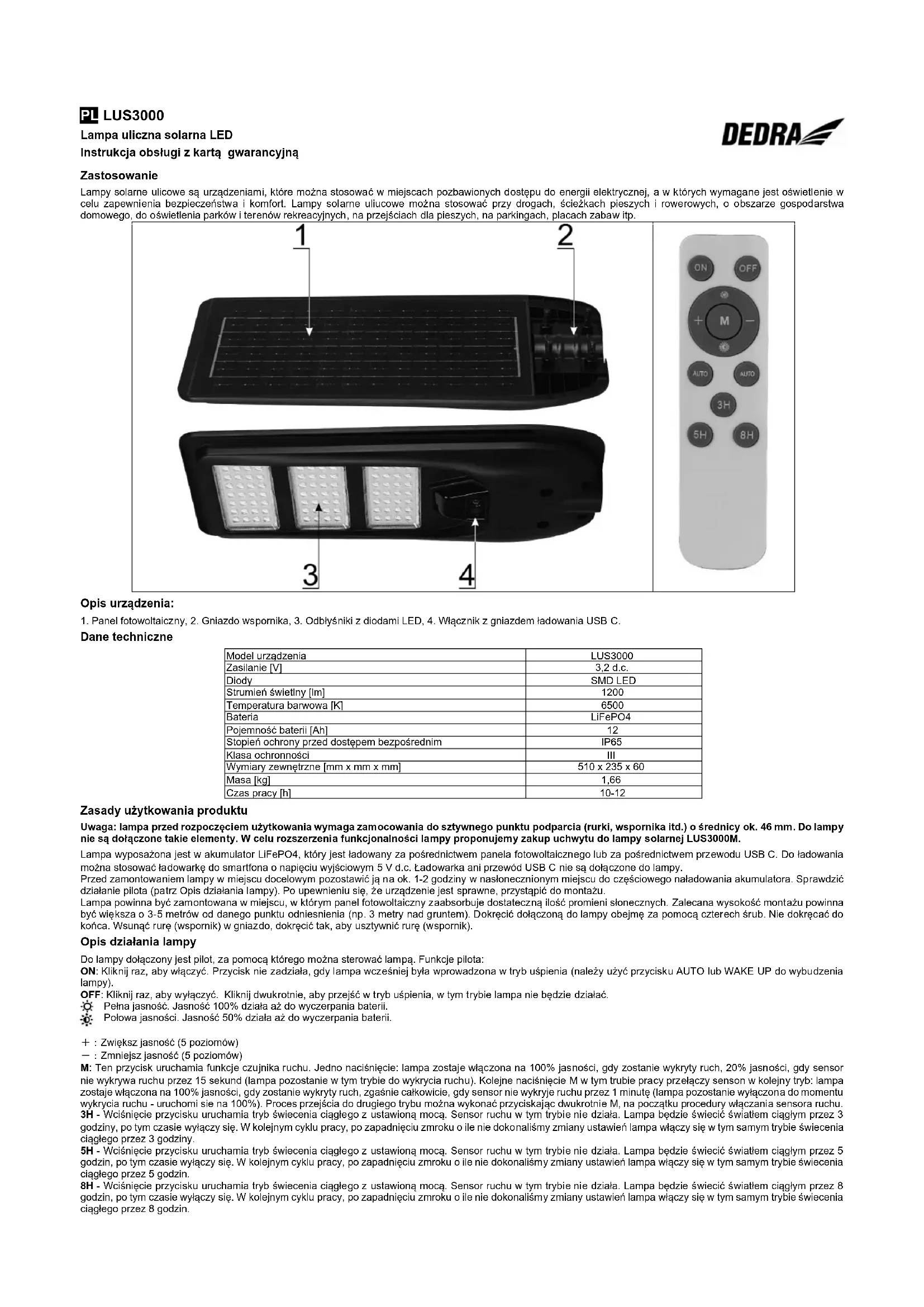 - Nie ładować bezpośrednio z panelu akumulatora samochodowego. Deklaracja zgodności znajduje się w siedzibie Dedra Exim Sp. z o.o. EN LUS3000 LED Solar Street Lamp Operating instructions with warranty card