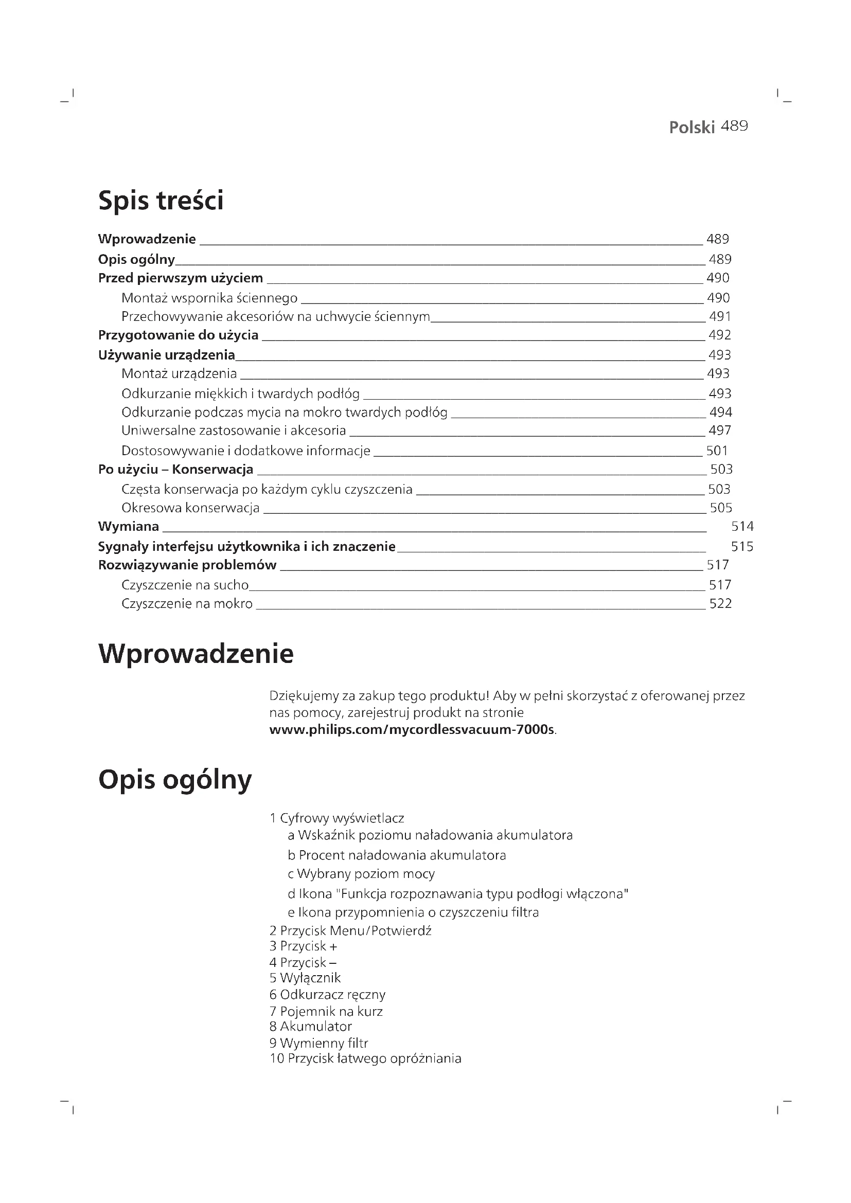 Polski Polski Spis treści Wprowadzenie ___________________________________________________________________________ 489 Opis ogólny_______________________________________________________________________________ 489 Przed pierwszym użyciem _________________________________________________________________ 490 Montaż wspornika ściennego ____________________________________________________________ 490 Przechowywanie akcesoriów na uchwycie ściennym_________________________________________ 491 Przygotowanie do użycia __________________________________________________________________ 492 Używanie urządzenia______________________________________________________________________ 493 Montaż urządzenia _____________________________________________________________________ 493 Odkurzanie miękkich itwardych podłóg ___________________________________________________ 493 Odkurzanie podczas mycia na mokro twardych podłóg ______________________________________ 494 Uniwersalne zastosowanie i akcesoria _____________________________________________________ 497 Dostosowywanie i dodatkowe informacje _________________________________________________ 501 Po użyciu – Konserwacja ___________________________________________________________________ 503 Częsta konserwacja po każdym cyklu czyszczenia ___________________________________________ 503 Okresowa konserwacja __________________________________________________________________ 505 Wymiana _________________________________________________________________________________ 514 Sygnały interfejsu użytkownika i ich znaczenie______________________________________________ 515 Rozwiązywanie problemów _______________________________________________________________ 517 Czyszczenie na sucho____________________________________________________________________ 517 Czyszczenie na mokro ___________________________________________________________________ 522 Wprowadzenie Dziękujemy za zakup tego produktu! Aby wpełni skorzystać zoferowanej przez nas pomocy, zarejestruj produkt na stronie www.philips.com/mycordlessvacuum-7000s. Opis ogólny 1 Cyfrowy wyświetlacz a Wskaźnik poziomu naładowania akumulatora b Procent naładowania akumulatora c Wybrany poziom mocy d Ikona "Funkcja rozpoznawania typu podłogi włączona" e Ikona przypomnienia o czyszczeniu filtra 2 Przycisk Menu/Potwierdź 3 Przycisk + 4 Przycisk – 5 Wyłącznik 6 Odkurzacz ręczny 7 Pojemnik na kurz 8 Akumulator 9 Wymienny filtr 10 Przycisk łatwego opróżniania490 Polski 11 Przycisk zwalniający pojemnik na kurz 12 Zasilacz 13 Śruby 14 Wspornik ścienny 15 Rura 16 Ssawka TriActive Smart LED 17 Delikatna szczotka do podłóg (tylko XC7067) 18 Zbiornik wody i nakładka mopująca z mikrofibry (tylko XC7163, XC7167) 19 Ssawka PetPro 20 Narzędzie uniwersalne 21 Miękka szczotka (tylko XC7065, XC7067, XC7167) 22 Ssawka do tapicerki (tylko XC7065, XC7067, XC6167) 23 Szczelinówka Przed pierwszym użyciem Montaż wspornika ściennego 1 Odwróć wspornik ścienny i odblokuj szarą dźwignię. Włóż port ładowania, upewniając się, że metalowa część jest widoczna i skierowana do góry z przodu wspornika ściennego. 2 Starannie ułóż kabel, wsuwając go do wyznaczonego rowka. 3 Zamknij szarą dźwignię. Upewnij się, że szara dźwignia słyszalnie zablokowała się na swoim miejscu.491 Polski 110 ± 2 cm 4 Zamocuj wspornik ścienny w preferowanym miejscu na ścianie, upewniając się, że otwory na śruby montażowe znajdują się około 110 cm od podłogi. Przestroga: Zachowaj ostrożność podczas wiercenia otworów wścianie wcelu zamocowania wspornika ściennego, aby uniknąć porażenia prądem. Uwaga: Dopilnuj, by umiejscowienie wspornika ściennego umożliwiało zawieszenie całego urządzenia na ścianie bez kontaktu ssawki z podłogą. 5 Po ustaleniu optymalnej pozycji i wysokości do przechowywania i ładowania urządzenia, mocno dokręć śruby, aby zamocować wspornik ścienny na miejscu. Przechowywanie akcesoriów na uchwycie ściennym Wszystkie akcesoria można przechowywać na uchwycie ściennym, z wyjątkiem jednoczesnego przechowywania ssawki PetPro i ssawki do tapicerki. Uwaga: Należy pamiętać, że na uchwycie ściennym nie można przechowywać jednocześnie ssawki PetPro i ssawki do tapicerki.492 Polski Przygotowanie do użycia Urządzenie jest wyposażone wakumulator litowo-jonowy. Pełne naładowanie całkowicie rozładowanego akumulatora zajmuje około 6 godzin. 1 Podłącz akumulator do głównego korpusu urządzenia tak, aby słyszalne było kliknięcie.