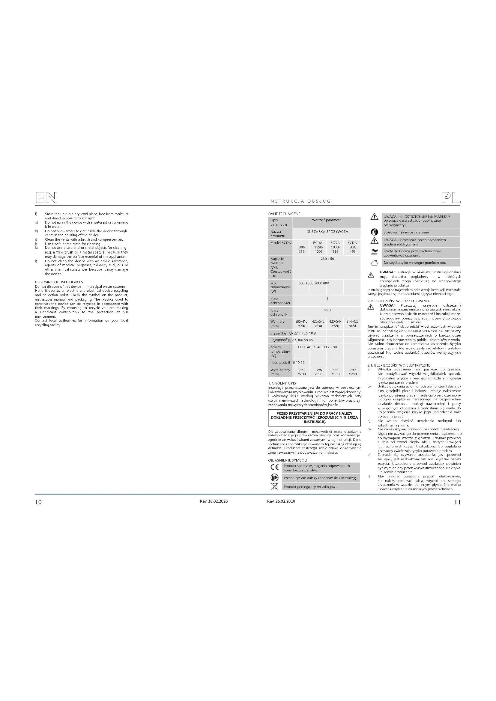 i sprężonym powietrzem. j) Do czyszczenia należy używać miękkiej, wilgotnej ściereczki. k) Do czyszczenia nie wolno używać ostrych i/lub metalowych przedmiotów (np. drucianej szczotki lub metalowej łopatki) ponieważ mogą one uszkodzić powierzchnię materiału, z którego wykonane jest urządzenie. l) Nie czyścić urządzenia substancja o odczynie kwasowym, środkami przeznaczenia medycznego, rozcieńczalnikami, paliwem, olejami lub innymi substancjami chemicznymi może to spowodować uszkodzenie urządzenia. USUWANIE ZUŻYTYCH URZĄDZEŃ. Po zakończeniu okresu użytkowania nie wolno usuwać niniejszego produktu poprzez normalne odpady komunalne, lecz należy go oddać do punktu zbiórki i recyklingu urządzeń elektrycznych i elektronicznych. Informuje o tym symbol, umieszczony na produkcie, instrukcji obsługi lub opakowaniu. Zastosowane w urządzeniu tworzywa nadają się do powtórnego użycia zgodnie z ich oznaczeniem. Dzięki powtórnemu użyciu, wykorzystaniu materiałów lub innym formom wykorzystania zużytych urządzeń wnoszą Państwo istotny wkład w ochronę naszego środowiska. Informacji o właściwym punkcie usuwania zużytych urządzeń udzieli Państwu lokalna administracja. TECHNICKÉ ÚDAJE Popis parametru Hodnota parametru Název výrobku FOOD DEHYDRATOR Model RCDA- 500/ 23S RCDA- 1350/ 100S RCDA- 1000/ 59S RCDA- 500/ 45S Jmenovité napětí napájení [V~]/ Frekvence [Hz] 230 / 50 Jmenovitý výkon [W]