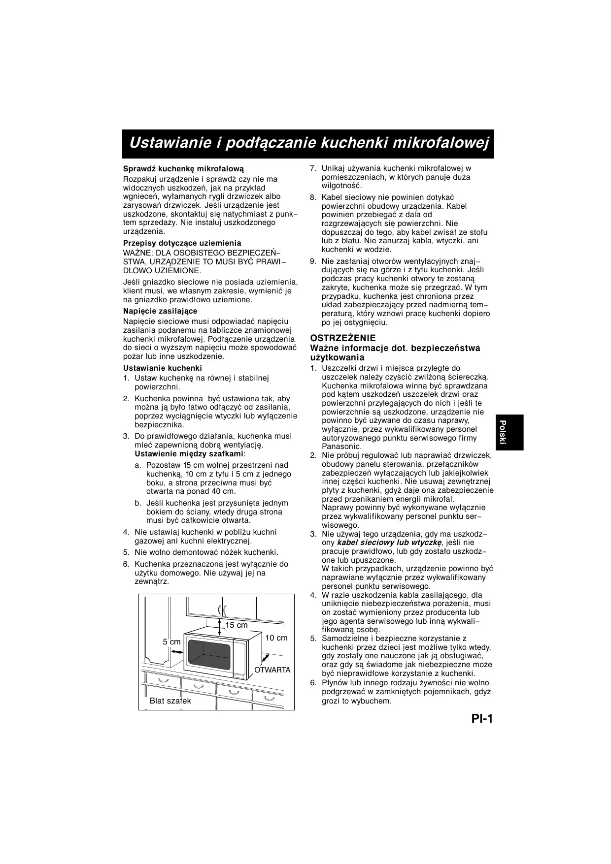 OSTRZEŻENIE Ważne informacje dot. bezpieczeństwa użytkowania 1. Uszczelki drzwi i miejsca przyległe do uszczelek należy czyścić zwilżoną ściereczką. Kuchenka mikrofalowa winna być sprawdzana pod kątem uszkodzeń uszczelek drzwi oraz powierzchni przylegających do nich i jeśli te powierzchnie są uszkodzone, urządzenie nie powinno być używane do czasu naprawy, wyłącznie, przez wykwalifikowany personel autoryzowanego punktu serwisowego firmy Panasonic. 2. Nie próbuj regulować lub naprawiać drzwiczek, obudowy panelu sterowania, przełączników zabezpieczeń wyłączających lub jakiejkolwiek innej części kuchenki. Nie usuwaj zewnętrznej płyty z kuchenki, gdyż daje ona zabezpieczenie przed przenikaniem energii mikrofal. Naprawy powinny być wykonywane wyłącznie przez wykwalifikowany personel punktu serwisowego. 3. Nie używaj tego urządzenia, gdy ma uszkodzony kabel sieciowy lub wtyczkę, jeśli nie pracuje prawidłowo, lub gdy zostało uszkodzone lub upuszczone. W takich przypadkach, urządzenie powinno być naprawiane wyłącznie przez wykwalifikowany personel punktu serwisowego. 4. W razie uszkodzenia kabla zasilającego, dla uniknięcie niebezpieczeństwa porażenia, musi on zostać wymieniony przez producenta lub jego agenta serwisowego lub inną wykwalifikowaną osobę. 5. Samodzielne i bezpieczne korzystanie z kuchenki przez dzieci jest możliwe tylko wtedy, gdy zostały one nauczone jak ją obsługiwać, oraz gdy są świadome jak niebezpieczne może być nieprawidłowe korzystanie z kuchenki. 6. Płynów lub innego rodzaju żywności nie wolno podgrzewać w zamkniętych pojemnikach, gdyż grozi to wybuchem.