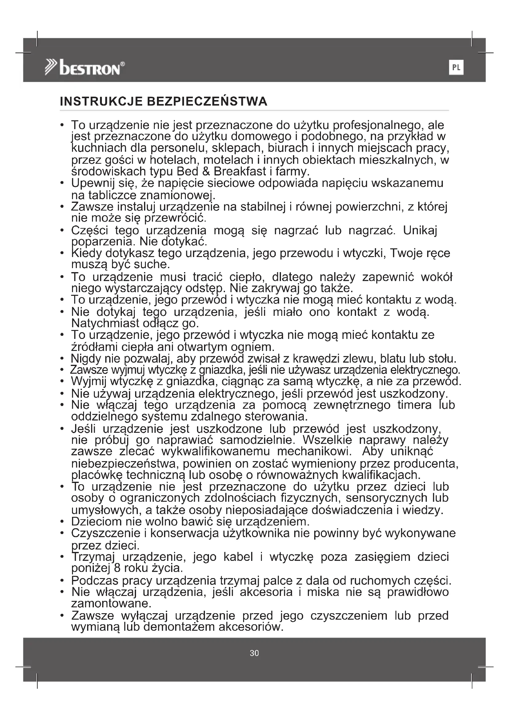 - Twoja gmina może poinformować Cię, gdzie w Twojej okolicy znaleźć wyznaczony punkt zbiórki odpadów. PRACA W mało prawdopodobnym przypadku awarii należy skontaktować się z obsługą klienta Bestron: www.bestron.com/service OPERACJA – Ogólne Poniższy opis jest zgodny z ilustracją na stronie 2.