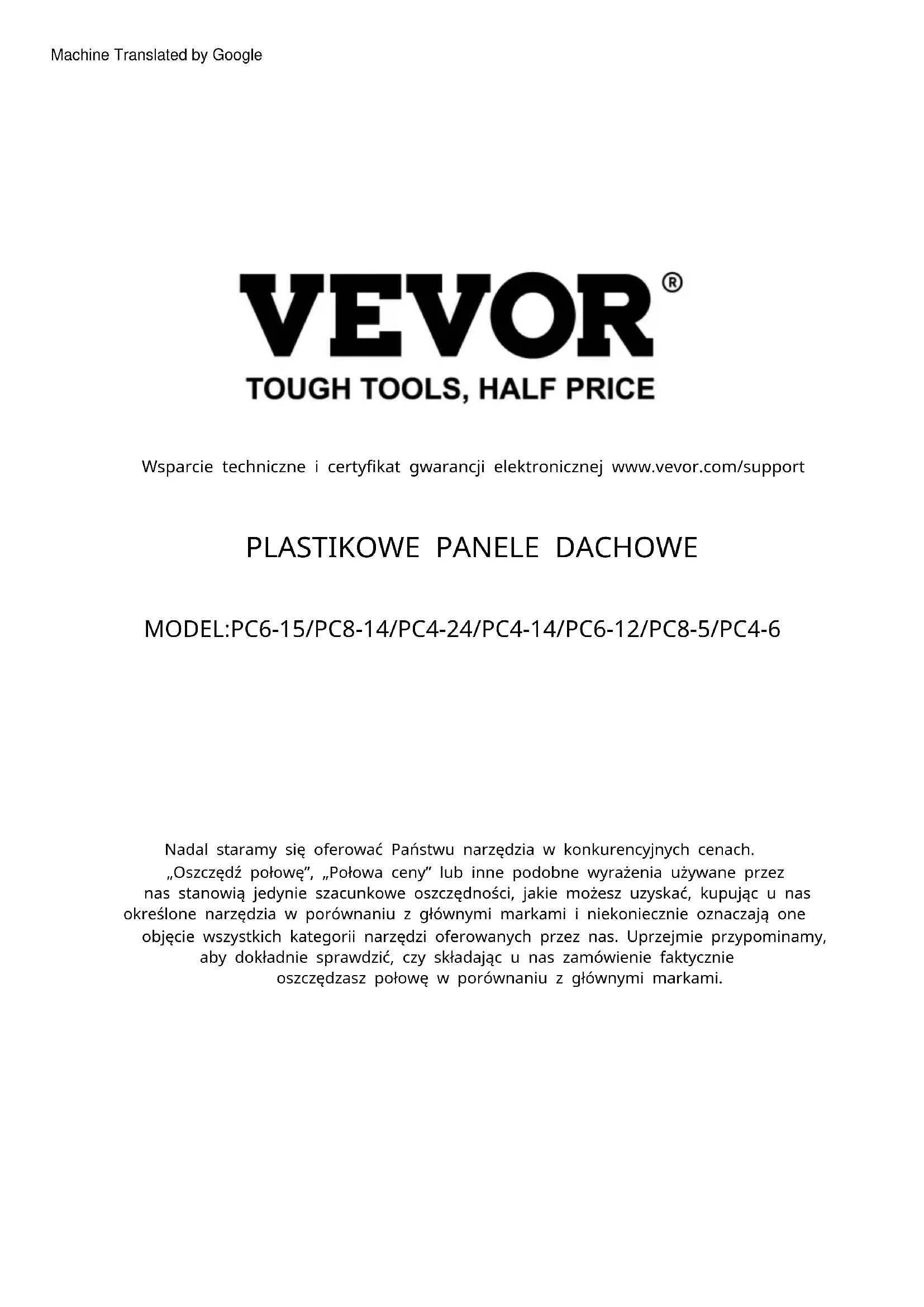 ConsultingLimitedOficina147,CenturionHouse,London Road,StainesuponThames,Surrey,TW184AX MainzerLandstr.69, 60329FráncfortdelMeno. REPRESENTANTECE REPRESENTANTEDELREINOUNIDO Machine Translated by GoogleSoportetécnicoycertificadodegarantía electrónicawww.vevor.com/support Machine Translated by GoogleMODEL:PC6-15/PC8-14/PC4-24/PC4-14/PC6-12/PC8-5/PC4-6 „Oszczędź połowę”, „Połowa ceny” lub inne podobne wyrażenia używane przez nas stanowią jedynie szacunkowe oszczędności, jakie możesz uzyskać, kupując u nas określone narzędzia w porównaniu z głównymi markami i niekoniecznie oznaczają one objęcie wszystkich kategorii narzędzi oferowanych przez nas. Uprzejmie przypominamy, aby dokładnie sprawdzić, czy składając u nas zamówienie faktycznie oszczędzasz połowę w porównaniu z głównymi markami. Nadal staramy się oferować Państwu narzędzia w konkurencyjnych cenach.