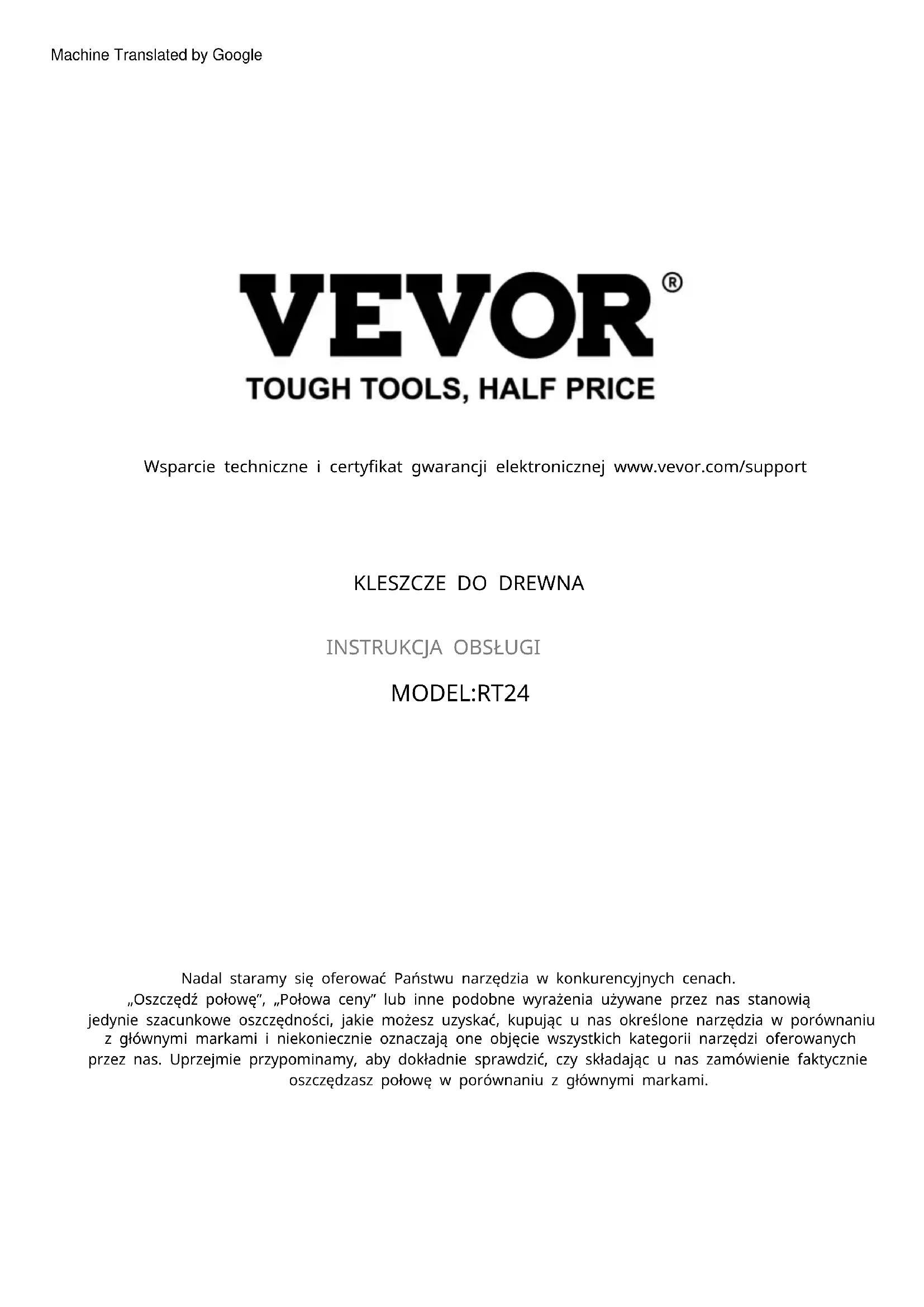 Wsparcie techniczne i certyfikat gwarancji elektronicznej www.vevor.com/support „Oszczędź połowę”, „Połowa ceny” lub inne podobne wyrażenia używane przez nas stanowią jedynie szacunkowe oszczędności, jakie możesz uzyskać, kupując u nas określone narzędzia w porównaniu z głównymi markami i niekoniecznie oznaczają one objęcie wszystkich kategorii narzędzi oferowanych przez nas. Uprzejmie przypominamy, aby dokładnie sprawdzić, czy składając u nas zamówienie faktycznie oszczędzasz połowę w porównaniu z głównymi markami. Nadal staramy się oferować Państwu narzędzia w konkurencyjnych cenach. Machine Translated by GoogleMODEL:RT24 POTRZEBUJESZ POMOCY? SKONTAKTUJ SIĘ Z NAMI!