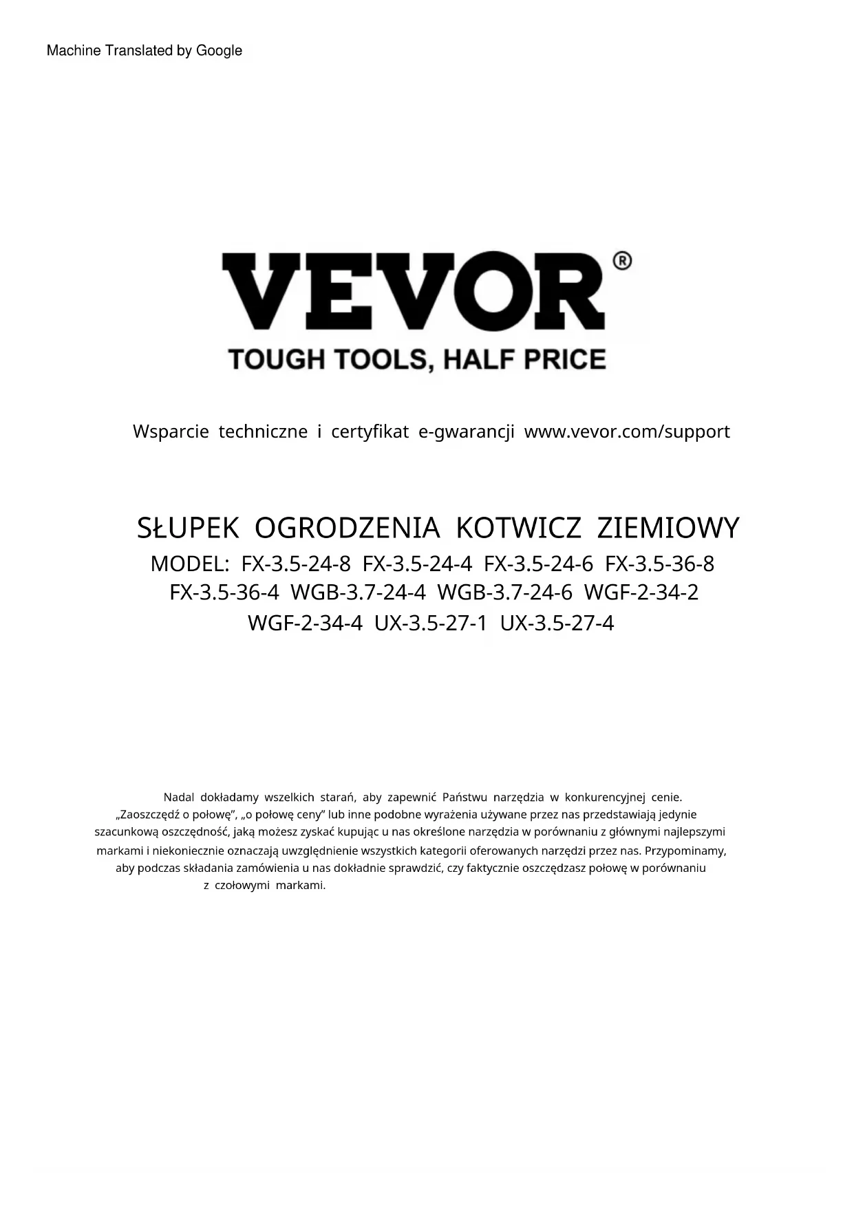 Fabricante:Shanghaimuxinmuyeyouxiangongsi Dirección:BaoshanquShuangchenglu803long11hao1602A1609shi Shanghai ImportadoaAUS:SIHAOPTYLTD.1ROKEVASTREETEASTWOOD NSW2122Australia ImportadoaEE.UU.:SanvenTechnologyLtd.Suite250,9166Anaheim Place,RanchoCucamonga,CA91730 Hechoenchina Machine Translated by GoogleMachine Translated by GoogleSoportetécnicoycertificadodegarantíaelectrónica www.vevor.com/support FabricadoenChina Machine Translated by GoogleSŁUPEK OGRODZENIA KOTWICZ ZIEMIOWY Nadal dokładamy wszelkich starań, aby zapewnić Państwu narzędzia w konkurencyjnej cenie. „Zaoszczędź o połowę”, „o połowę ceny” lub inne podobne wyrażenia używane przez nas przedstawiają jedynie szacunkową oszczędność, jaką możesz zyskać kupując u nas określone narzędzia w porównaniu z głównymi najlepszymi markami i niekoniecznie oznaczają uwzględnienie wszystkich kategorii oferowanych narzędzi przez nas. Przypominamy, aby podczas składania zamówienia u nas dokładnie sprawdzić, czy faktycznie oszczędzasz połowę w porównaniu z czołowymi markami. Wsparcie techniczne i certyfikat e-gwarancji www.vevor.com/support WGF-2-34-4 UX-3.5-27-1 UX-3.5-27-4 MODEL: FX-3.5-24-8 FX-3.5-24-4 FX-3.5-24-6 FX-3.5-36-8 FX-3.5-36-4 WGB-3.7-24-4 WGB-3.7-24-6 WGF-2-34-2 Machine Translated by GoogleMachine Translated by GoogleFX-3.5-24-6