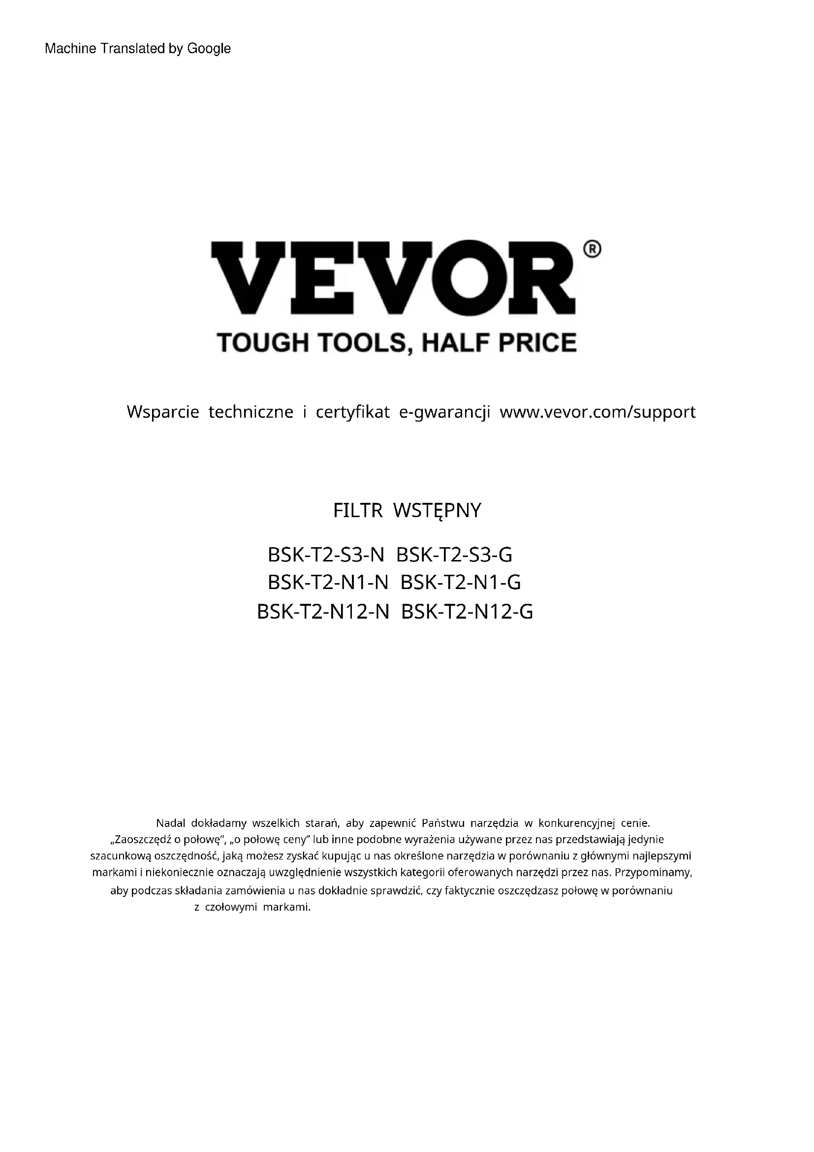 Wsparcie techniczne i certyfikat e-gwarancji www.vevor.com/support „Zaoszczędź o połowę”, „o połowę ceny” lub inne podobne wyrażenia używane przez nas przedstawiają jedynie szacunkową oszczędność, jaką możesz zyskać kupując u nas określone narzędzia w porównaniu z głównymi najlepszymi markami i niekoniecznie oznaczają uwzględnienie wszystkich kategorii oferowanych narzędzi przez nas. Przypominamy, aby podczas składania zamówienia u nas dokładnie sprawdzić, czy faktycznie oszczędzasz połowę w porównaniu z czołowymi markami. Nadal dokładamy wszelkich starań, aby zapewnić Państwu narzędzia w konkurencyjnej cenie. Machine Translated by GoogleTo jest oryginalna instrukcja. Przed przystąpieniem do obsługi prosimy o dokładne zapoznanie się ze wszystkimi instrukcjami. VEVOR zastrzega sobie jasną interpretację naszej instrukcji obsługi. Wygląd produktu zależy od produktu, który otrzymałeś. Proszę wybaczyć nam, że nie będziemy ponownie informować Państwa, jeśli pojawią się jakieś aktualizacje technologii lub oprogramowania naszego produktu. Masz pytania dotyczące produktu? Potrzebujesz wsparcia technicznego? Prosimy o kontakt: Wsparcie techniczne i certyfikat e-gwarancji www.vevor.com/support