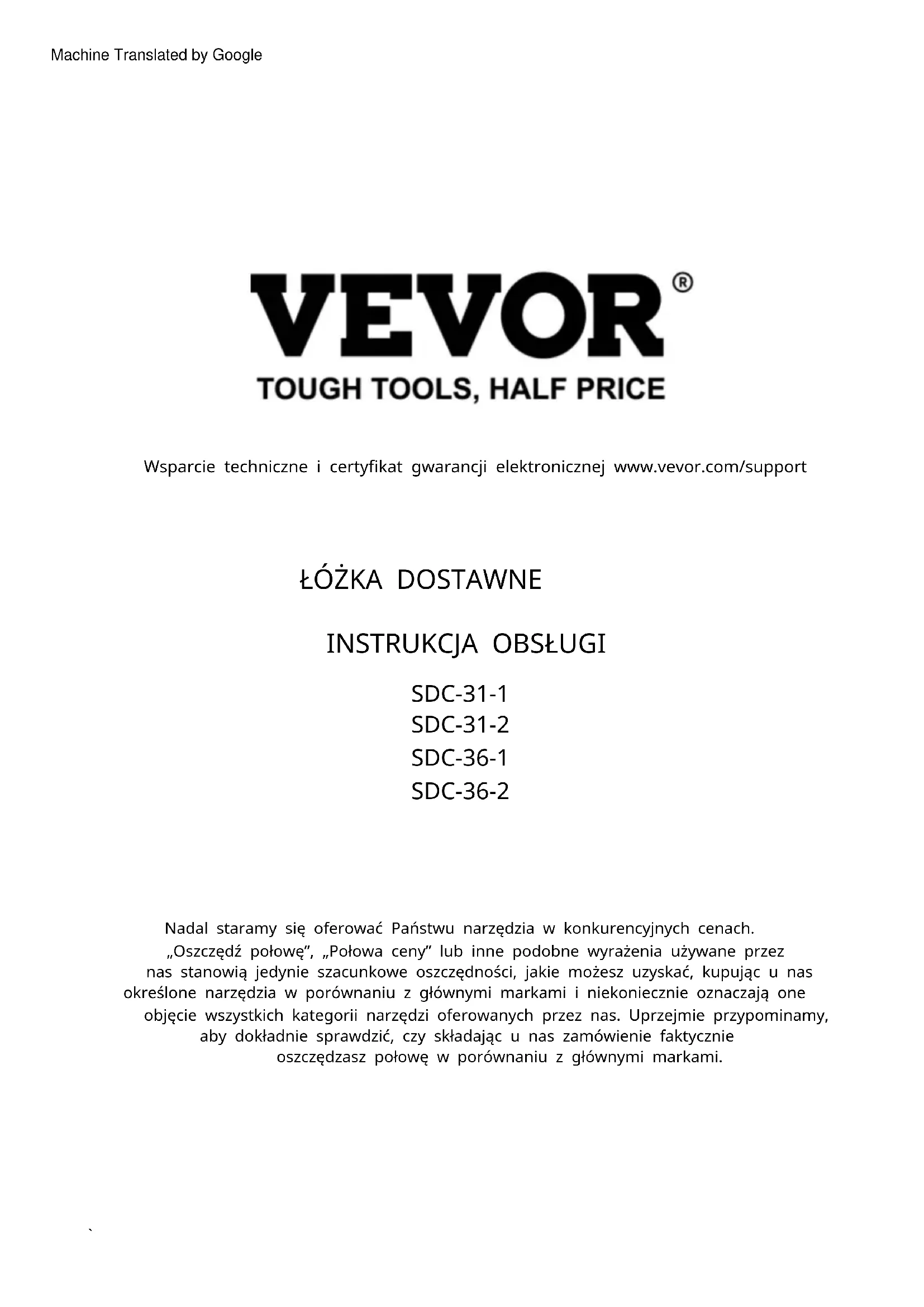 Machine Translated by GoogleWsparcie techniczne i certyfikat gwarancji elektronicznej www.vevor.com/support To jest oryginalna instrukcja, przed użyciem należy uważnie przeczytać wszystkie instrukcje. VEVOR zastrzega sobie jasną interpretację naszej instrukcji obsługi. Wygląd produktu będzie zależał od produktu, który otrzymałeś. Prosimy o wybaczenie, że nie poinformujemy Cię ponownie, jeśli w naszym produkcie pojawią się jakiekolwiek aktualizacje technologiczne lub oprogramowania. MODEL:SDC-31-1 SDC-31-2 SDC-36-1 SDC-36-2 Masz pytania dotyczące produktu? Potrzebujesz wsparcia technicznego? Skontaktuj się z nami: POTRZEBUJESZ POMOCY? SKONTAKTUJ SIĘ Z NAMI! ŁÓŻKA DOSTAWNE