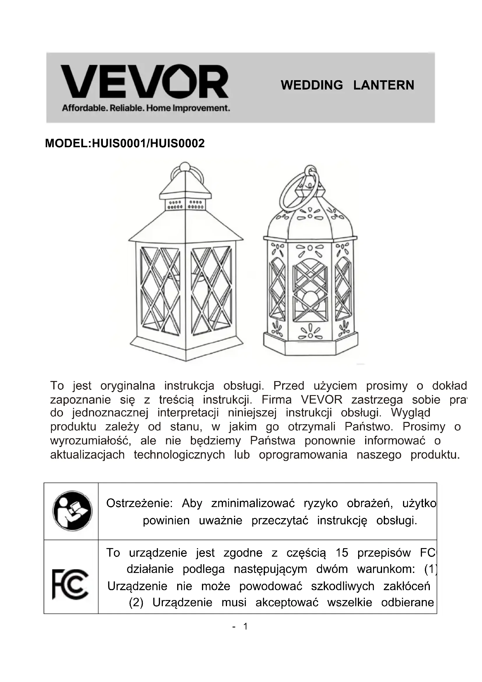 To jest oryginalna instrukcja obsługi. Przed użyciem prosimy o dokładne zapoznanie się z treścią instrukcji. Firma VEVOR zastrzega sobie prawo do jednoznacznej interpretacji niniejszej instrukcji obsługi. Wygląd produktu zależy od stanu, w jakim go otrzymali Państwo. Prosimy o wyrozumiałość, ale nie będziemy Państwa ponownie informować o aktualizacjach technologicznych lub oprogramowania naszego produktu. Ostrzeżenie: Aby zminimalizować ryzyko obrażeń, użytkownik powinien uważnie przeczytać instrukcję obsługi. To urządzenie jest zgodne z częścią 15 przepisów FCC. Jego działanie podlega następującym dwóm warunkom: (1) Urządzenie nie może powodować szkodliwych zakłóceń oraz (2) Urządzenie musi akceptować wszelkie odbierane WEDDING LANTERN- 2 - zakłócenia, w tym zakłócenia, które mogą powodować niepożądane działanie. Niniejszy produkt podlega przepisom Dyrektywy Europejskiej 2012/19/WE. Symbol przedstawiający przekreślony kosz na śmieci na kółkach oznacza, że produkt wymaga selektywnej zbiórki odpadów w Unii Europejskiej. Dotyczy to produktu i wszystkich akcesoriów oznaczonych tym symbolem. Produktów oznaczonych tym symbolem nie można wyrzucać razem z normalnymi odpadami domowymi, lecz należy je dostarczyć do punktu zbiórki urządzeń elektrycznych i elektronicznych przeznaczonych do recyklingu. INSTRUCTIONS Dziękujemy bardzo za wybór tej Lampionu Ślubnego Przed użyciem należy przeczytać całą instrukcję. Zawarte w niej informacje pomogą uzyskać najlepsze możliwe rezultaty. OSTROŻNOŚĆ : 11.Chociaż ten produkt wykonany jest ze szkła wysokiej jakości, może ono ulec uszkodzeniu podczas transportu. Prosimy o sprawdzenie tego przed otwarciem opakowania. 12.Produkty z tworzyw sztucznych należy przechowywać z dala od źródeł ognia i środowisk o wysokiej temperaturze.