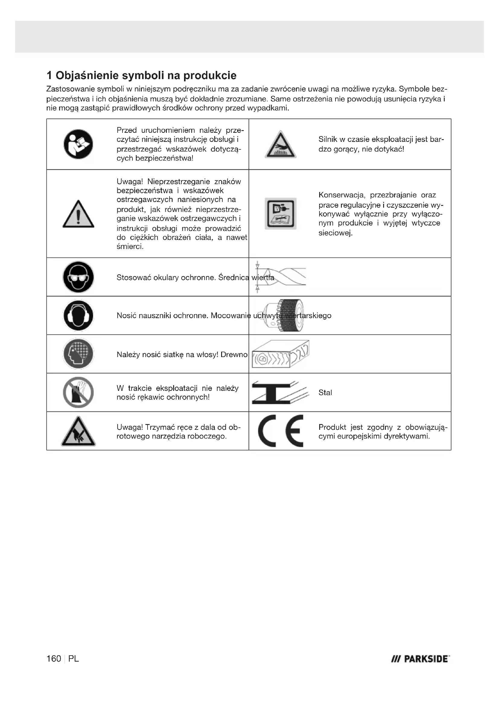 - A parkside-diy.com címen megtekinthető és letölthető ez a kézikönyv és számos másik is. Ezzel a QR-kóddal közvetlenül a parkside-diy.com oldalra jut. Válassza ki az országot, és keresse meg a keresési ablak révén a ke- zelési útmutatót. A cikkszám (IAN) 465594_2404 megadásával juthat el az adott termékhez tartozó kezelési út- mutatóhoz. Szerviz elérhetősége (HU): Név: ATISGEP Kft Szentesi út 100 HU - 5903 Orosháza Telefon: 00800 4003 4003 E-mail: service.HU@scheppach.com Székhely: Magyarország 158 | HUSpis treści 1 Objaśnienie symboli na produkcie................................................................................................................... 160 2 Wprowadzenie ................................................................................................................................................. 161 3 Opis produktu (rys. 1-16) ................................................................................................................................. 161 4 Zakres dostawy (rys. 2) .................................................................................................................................... 161 5 Użytkowanie zgodne z przeznaczeniem.......................................................................................................... 162 6 Wskazówki dotyczące bezpieczeństwa........................................................................................................... 162 7 Dane techniczne .............................................................................................................................................. 165 8 Rozpakowanie.................................................................................................................................................. 165 9 Montaż ............................................................................................................................................................. 166 10 Uruchomienie wstępne .................................................................................................................................... 167 11 Obsługa............................................................................................................................................................ 169 12 Wskazówki dotyczące pracy............................................................................................................................ 169 13 Przyłącze elektryczne....................................................................................................................................... 170 14 Transport (rys. 1) .............................................................................................................................................. 171 15 Konserwacja i czyszczenie .............................................................................................................................. 171 16 Przechowywanie .............................................................................................................................................. 172 17 Naprawa i zamawianie części zamiennych...................................................................................................... 172 18 Utylizacja i ponowne wykorzystanie ................................................................................................................ 172 19 Pomoc dotycząca usterek ............................................................................................................................... 173 20 Deklaracja zgodności UE................................................................................................................................. 174 21 Gwarancja ........................................................................................................................................................ 175 22 Rysunek eksplozji ............................................................................................................................................ 194 PL | 1591 Objaśnienie symboli na produkcie Zastosowanie symboli w niniejszym podręczniku ma za zadanie zwrócenie uwagi na możliwe ryzyka. Symbole bez- pieczeństwa i ich objaśnienia muszą być dokładnie zrozumiane. Same ostrzeżenia nie powodują usunięcia ryzyka i nie mogą zastąpić prawidłowych środków ochrony przed wypadkami. Przed uruchomieniem należy prze- czytać niniejszą instrukcję obsługi i przestrzegać wskazówek dotyczą- cych bezpieczeństwa! Silnik w czasie eksploatacji jest bar- dzo gorący, nie dotykać! Uwaga! Nieprzestrzeganie znaków bezpieczeństwa i wskazówek ostrzegawczych naniesionych na produkt, jak również nieprzestrze- ganie wskazówek ostrzegawczych i instrukcji obsługi może prowadzić do ciężkich obrażeń ciała, a nawet śmierci. Konserwacja, przezbrajanie oraz prace regulacyjne i czyszczenie wy- konywać wyłącznie przy wyłączo- nym produkcie i wyjętej wtyczce sieciowej. Stosować okulary ochronne. Średnica wiertła Nosić nauszniki ochronne. Mocowanie uchwytu wiertarskiego Należy nosić siatkę na włosy! Drewno W trakcie eksploatacji nie należy nosić rękawic ochronnych! Stal Uwaga! Trzymać ręce z dala od ob- rotowego narzędzia roboczego. Produkt jest zgodny z obowiązują- cymi europejskimi dyrektywami. 160 | PL2 Wprowadzenie Producent: Scheppach GmbH Günzburger Straße 69 D-89335 Ichenhausen Szanowny Kliencie Życzymy dużo satysfakcji i powodzenia podczas pracy z nowym produktem. Wskazówka: Zgodnie z obowiązującą ustawą o odpowiedzialności cywilnej za produkt, producent nie odpowiada za szko- dy powstałe przy tym produkcie lub przez ten produkt w przypadku: