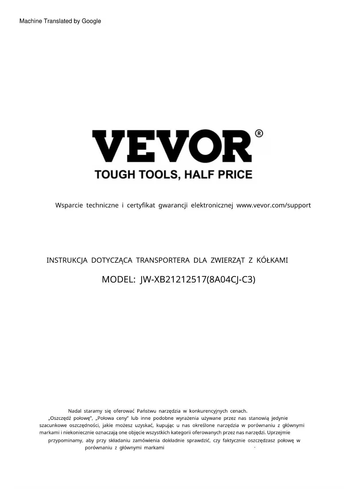 Machine Translated by GoogleWsparcie techniczne i certyfikat gwarancji elektronicznej www.vevor.com/support Masz pytania dotyczące produktu? Potrzebujesz wsparcia technicznego? Skontaktuj się z nami: To jest oryginalna instrukcja, przed użyciem należy uważnie przeczytać wszystkie instrukcje. VEVOR zastrzega sobie jasną interpretację naszej instrukcji obsługi. Wygląd produktu będzie zależał od produktu, który otrzymałeś. Prosimy o wybaczenie, że nie poinformujemy Cię ponownie, jeśli w naszym produkcie pojawią się jakiekolwiek aktualizacje technologiczne lub oprogramowania. JW-XB21212517(8A04CJ-C3) POTRZEBUJESZ POMOCY? SKONTAKTUJ SIĘ Z NAMI!