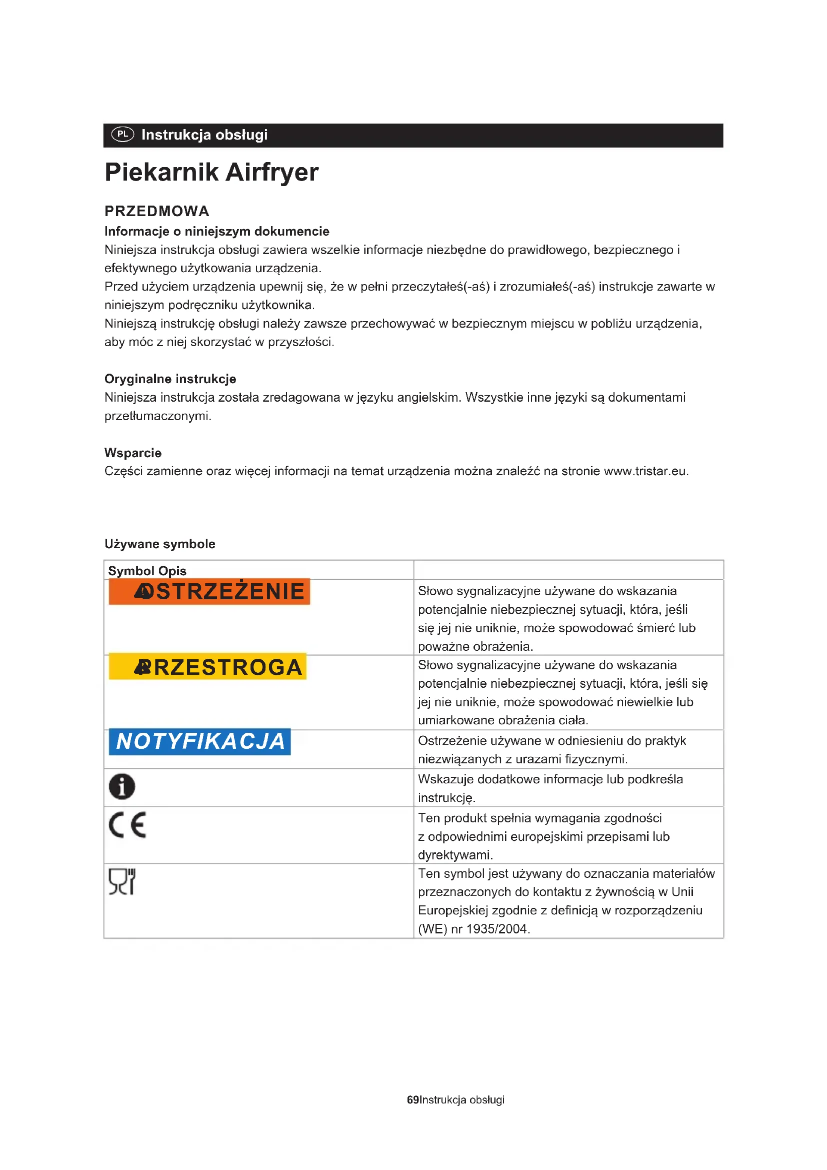 Instrukcja obsługi Piekarnik Airfryer PRZEDMOWA Informacje o niniejszym dokumencie Niniejsza instrukcja obsługi zawiera wszelkie informacje niezbędne do prawidłowego, bezpiecznego i efektywnego użytkowania urządzenia. Przed użyciem urządzenia upewnij się, że w pełni przeczytałeś(-aś) i zrozumiałeś(-aś) instrukcje zawarte w niniejszym podręczniku użytkownika. Niniejszą instrukcję obsługi należy zawsze przechowywać w bezpiecznym miejscu w pobliżu urządzenia, aby móc z niej skorzystać w przyszłości. Oryginalne instrukcje Niniejsza instrukcja została zredagowana w języku angielskim. Wszystkie inne języki są dokumentami przetłumaczonymi. Wsparcie Części zamienne oraz więcej informacji na temat urządzenia można znaleźć na stronie www.tristar.eu. Używane symbole Symbol Opis