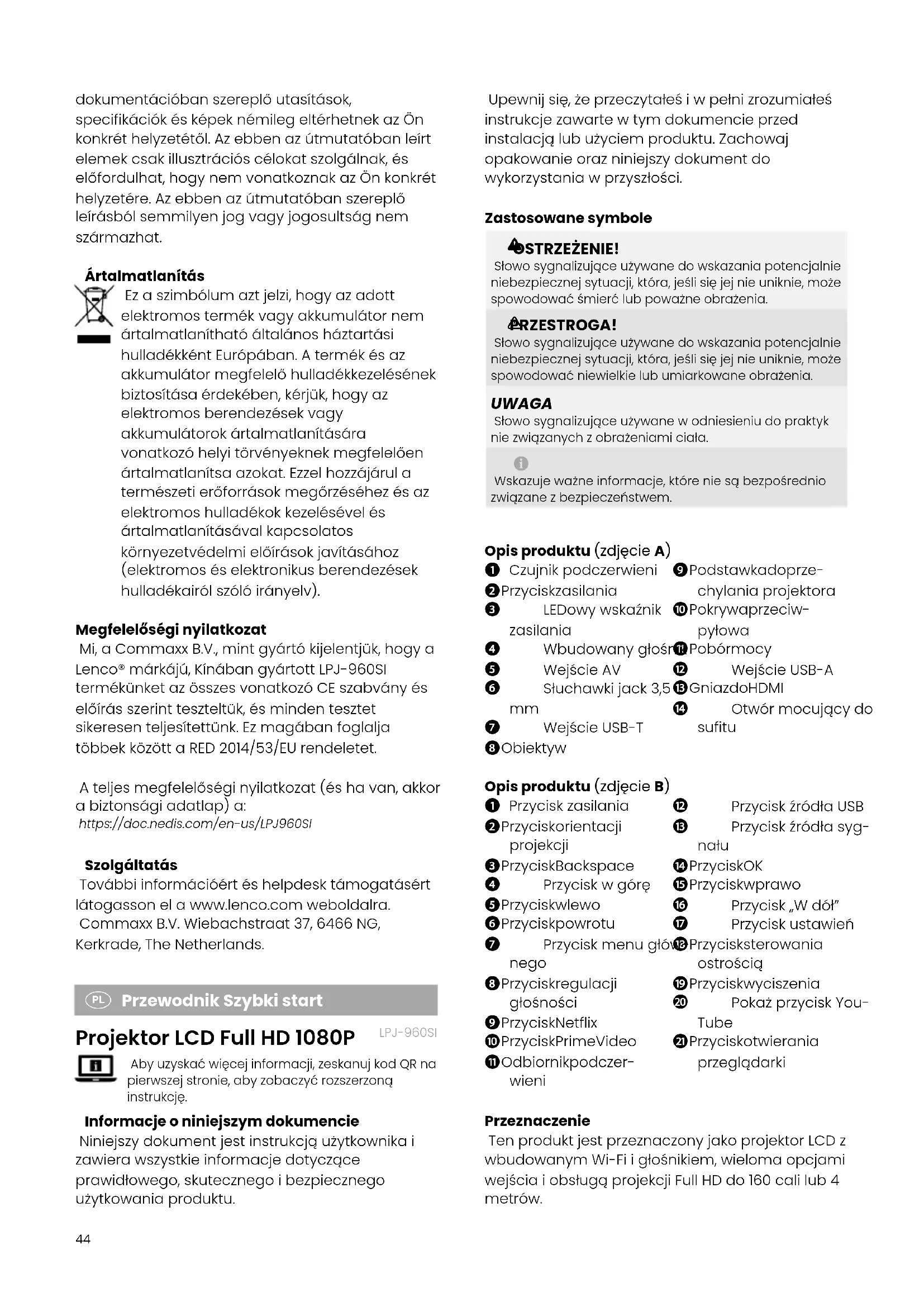 Przewodnik Szybki start Projektor LCD Full HD 1080P LPJ-960SI Abyuzyskaćwięcejinformacji,zeskanujkodQRnapierwszejstronie,abyzobaczyćrozszerzonąinstrukcję. Informacje o niniejszym dokumencie Niniejszydokumentjestinstrukcjąużytkownikai zawierawszystkieinformacjedotyczące prawidłowego,skutecznegoibezpiecznego użytkowaniaproduktu.45Lenco | Quick start guide możespowodowaćjegouszkodzeniei doprowadzićdoprzegrzanialubporażenia prądem.Zzasilaczemnależyzawszeobchodzić sięostrożnie.