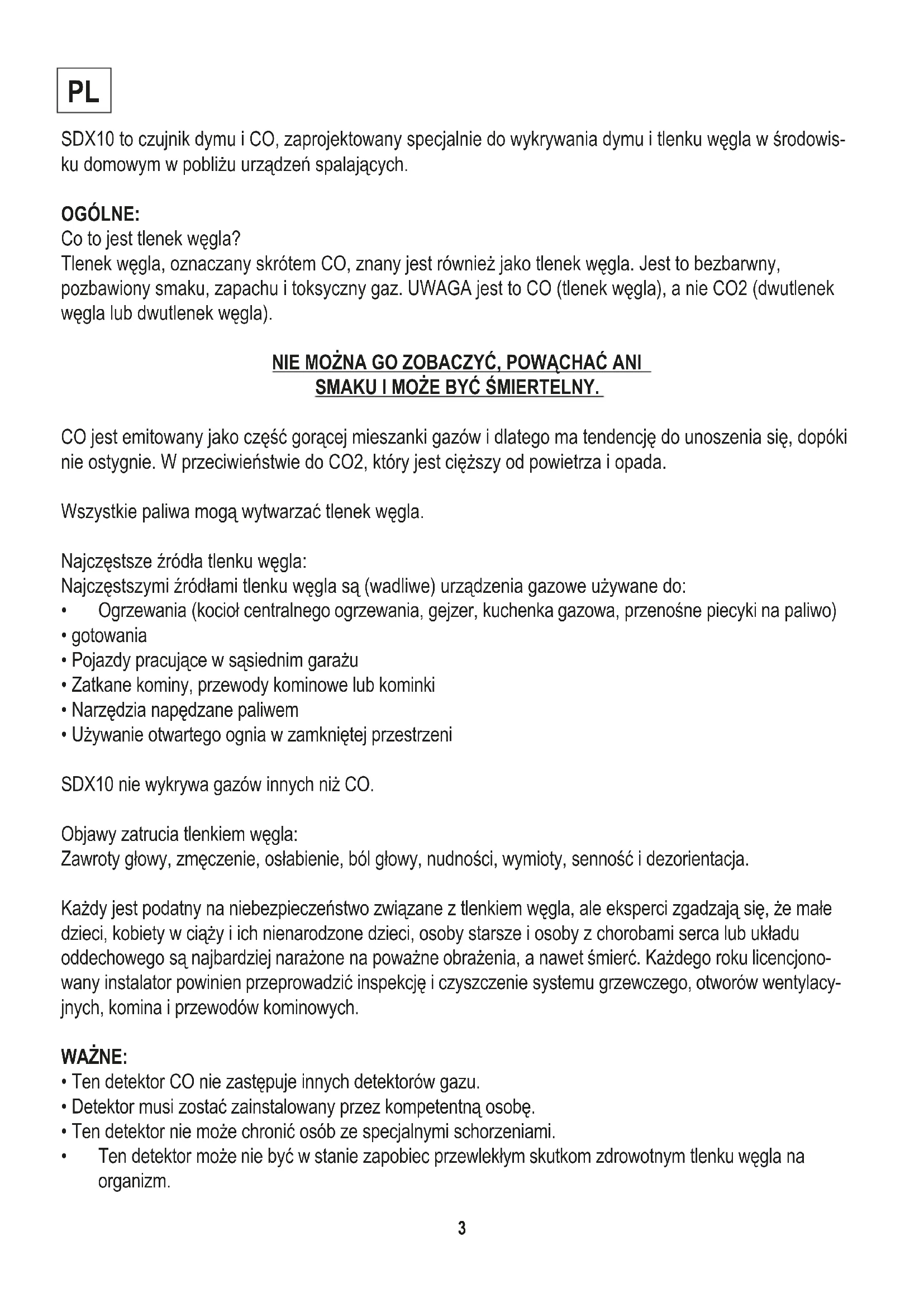 SDX10 to czujnik dymu i CO, zaprojektowany specjalnie do wykrywania dymu i tlenku węgla w środowis- ku domowym w pobliżu urządzeń spalających. OGÓLNE: Co to jest tlenek węgla? Tlenek węgla, oznaczany skrótem CO, znany jest również jako tlenek węgla. Jest to bezbarwny, pozbawiony smaku, zapachu i toksyczny gaz. UWAGA jest to CO (tlenek węgla), a nie CO2 (dwutlenek węgla lub dwutlenek węgla). NIE MOŻNA GO ZOBACZYĆ, POWĄCHAĆ ANI SMAKU I MOŻE BYĆ ŚMIERTELNY. CO jest emitowany jako część gorącej mieszanki gazów i dlatego ma tendencję do unoszenia się, dopóki nie ostygnie. W przeciwieństwie do CO2, który jest cięższy od powietrza i opada. Wszystkie paliwa mogą wytwarzać tlenek węgla. Najczęstsze źródła tlenku węgla: Najczęstszymi źródłami tlenku węgla są (wadliwe) urządzenia gazowe używane do: