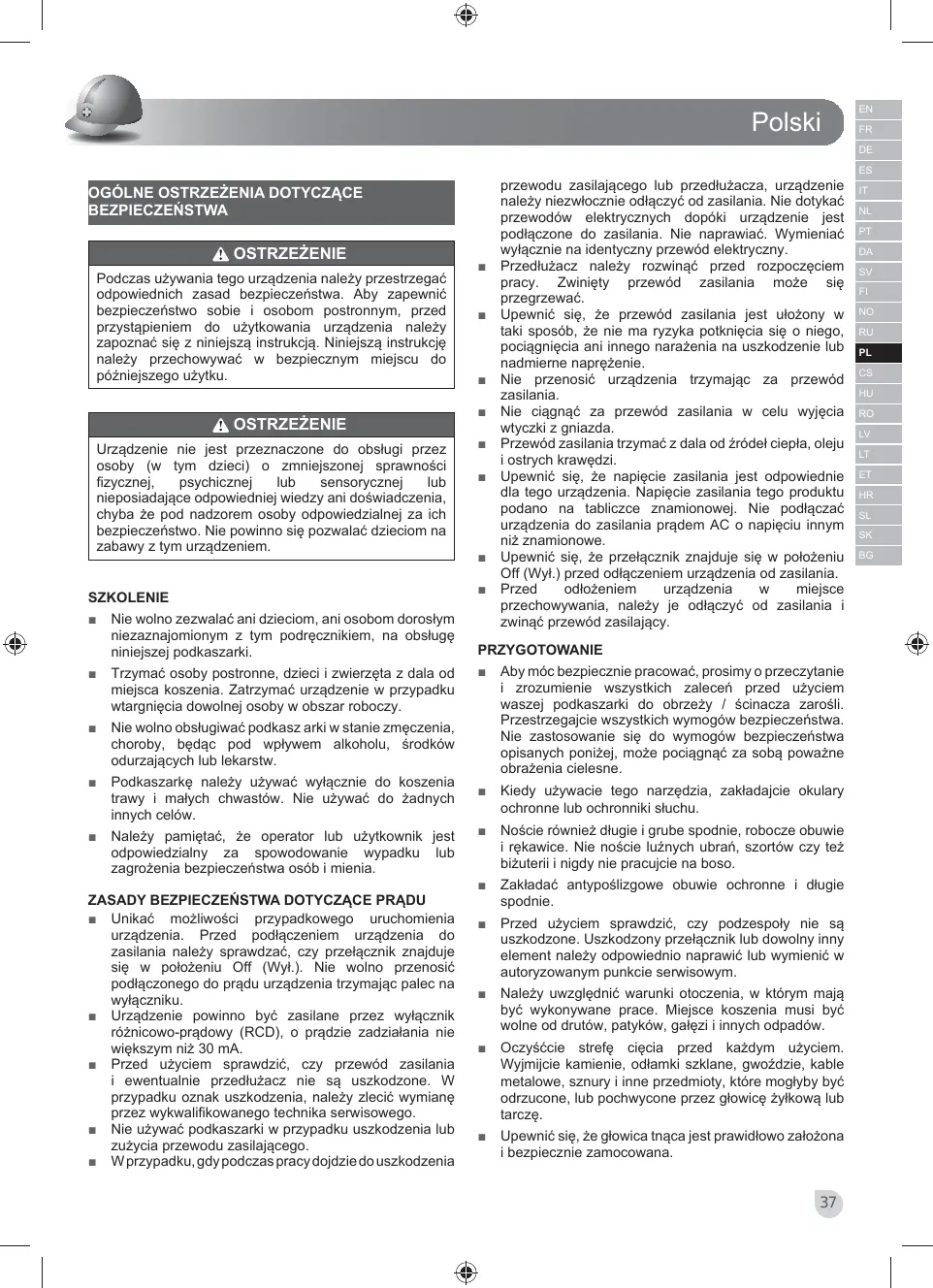 Aby móc bezpiecznie pracować, prosimy o przeczytanie i zrozumienie wszystkich zaleceń przed użyciem waszej podkaszarki do obrzeży / ścinacza zarośli. Przestrzegajcie wszystkich wymogów bezpieczeństwa. Nie zastosowanie się do wymogów bezpieczeństwa opisanych poniżej, może pociągnąć za sobą poważne obrażenia cielesne.