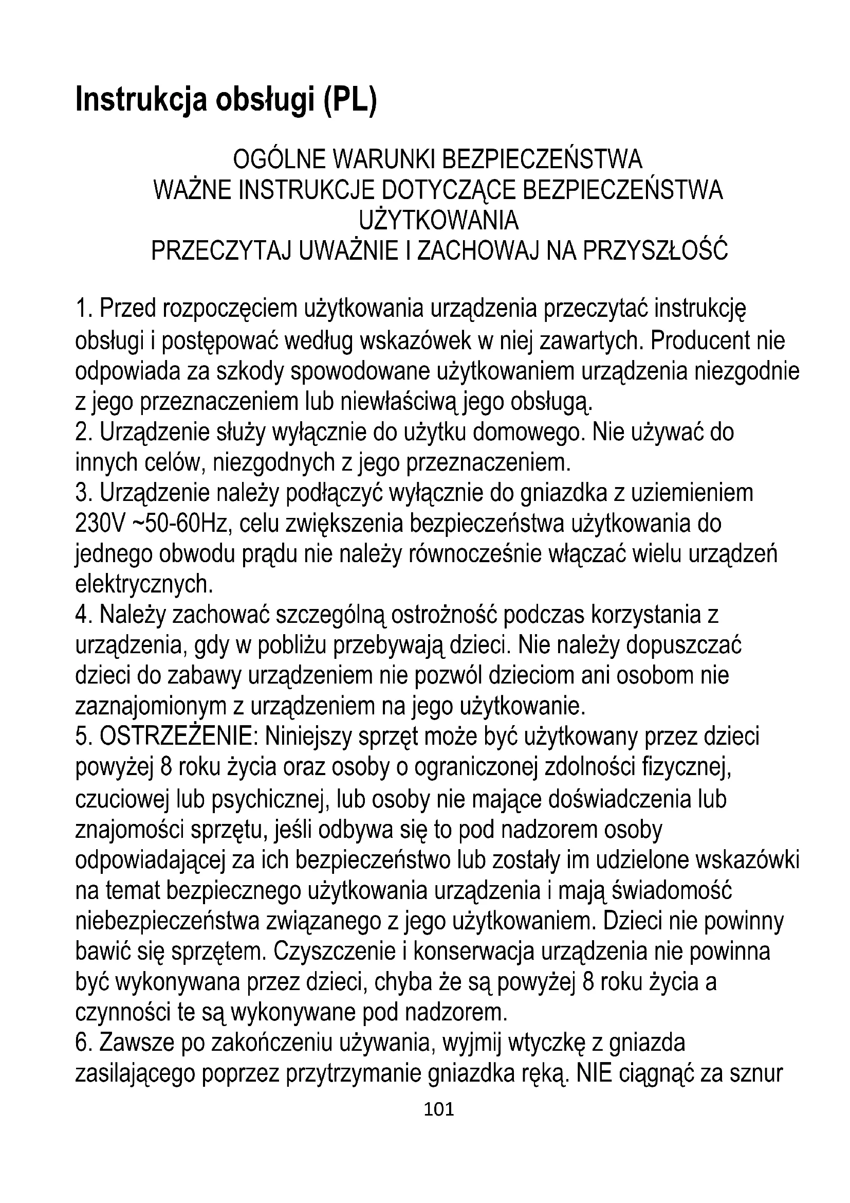 powyżej 8 roku życia oraz osoby o ograniczonej zdolności fizycznej, czuciowej lub psychicznej, lub osoby nie mające doświadczenia lub znajomości sprzętu, jeśli odbywa się to pod nadzorem osoby odpowiadającej za ich bezpieczeństwo lub zostały im udzielone wskazówki na temat bezpiecznego użytkowania urządzenia i mają świadomość niebezpieczeństwa związanego z jego użytkowaniem. Dzieci nie powinny bawić się sprzętem. Czyszczenie i konserwacja urządzenia nie powinna być wykonywana przez dzieci, chyba że są powyżej 8 roku życia a czynności te są wykonywane pod nadzorem.