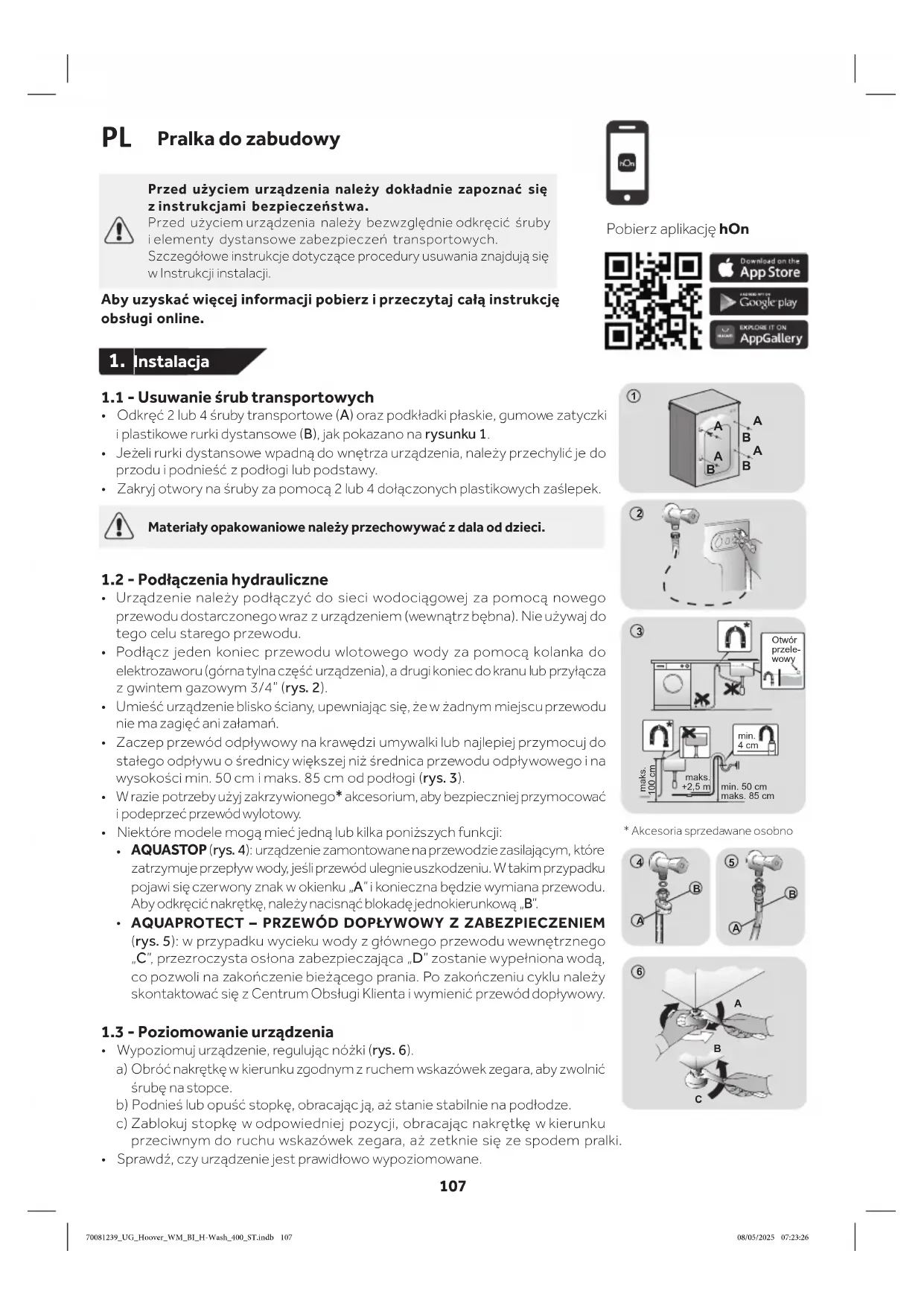 Przed użyciem urządzenia należy dokładnie zapoznać się z instrukcjami bezpieczeństwa. Przed użyciem urządzenia należy bezwzględnie odkręcić śruby i elementy dystansowe zabezpieczeń transportowych. Szczegółowe instrukcje dotyczące procedury usuwania znajdują się w Instrukcji instalacji. Aby uzyskać więcej informacji pobierz i przeczytaj całą instrukcję obsługi online. Pobierz aplikację hOn
