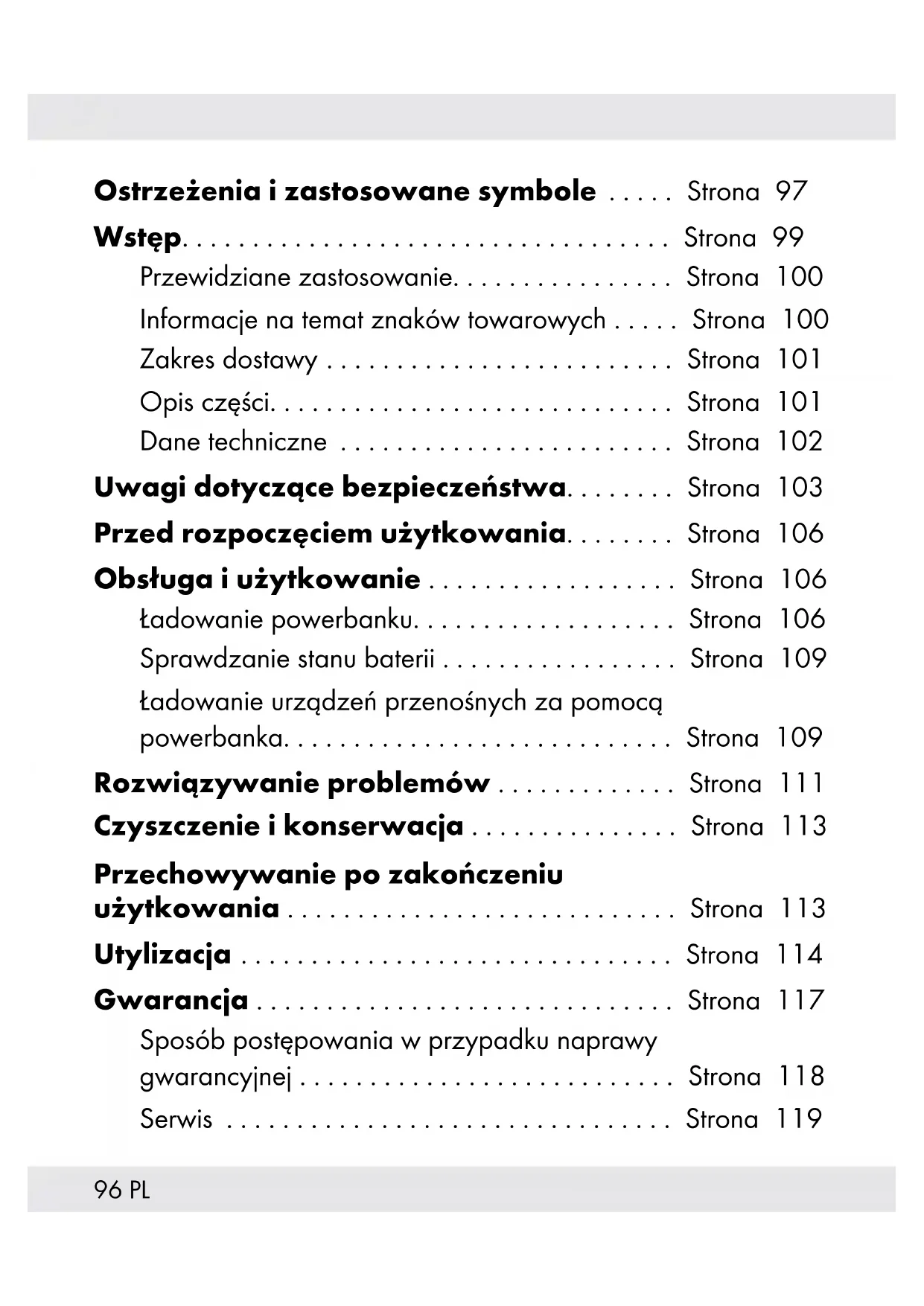 - Jeśli produkt nie będzie używany przez dłuższy czas, należy w pełni naładować wbudowaną baterię, aby wydłużyć okres jej żywotności. Baterię długo nieużywanego produktu należy regularnie ładować. Jest to konieczne do jej utrzymania. Rozwiązywanie problemów = Problem = Przyczyna = Rozwiązanie Powerbank[3] nie został naładowany. Może to być spowodowane nieprawidłowym podłączeniem powerbanka. Sprawdź, czy podłączono.112 PL Aby naładować powerbank, należy użyć zasilacz z napięciem wyjścia i prądem pasującym do napięcia wyjścia i prądu, zgodnie z opisem w części „Dane techniczne” tej instrukcji obsługi. Nie można naładować podłączonego urządzenia. Bateria się rozładowała. Naładuj baterię. Urządzenie nie jest podłączone. Urządzenie nie jest podłączone. Sprawdź, czy podłączono. Naciśnij krótko przycisk włączania/wyłączania [6] w celu rozpoczęcia ładowania. Pobór prądu przez podłączone urządzenie może być zbyt niski. Sprawdź w instrukcji obsługi podłączonego urządzenia, czy jego pobór prądu jest zgodny z parametrami produktu. Minimalne natężenie wyjściowe powerbanka wynosi ok. 60 mA. Powerbank[3] nie reaguje na naciskanie przycisku lub, po podłączeniu urządzenia, chociaż bateria jest ładowana. Pobór energii przez podłączone urządzenia jest zbyt wysoki. Spowodowało to uaktywnienie wewnętrznego zabezpieczenia nadprądowego. Zmniejsz liczbę podłączonych urządzeń i naciśnij przycisk włączania/wyłączania [6].113PL Czyszczenie i konserwacja Wewnątrz nie ma żadnych części wymagających konserwacji. Dostanie się wilgoci do wnętrza produktu może doprowadzić do jego uszkodzenia.