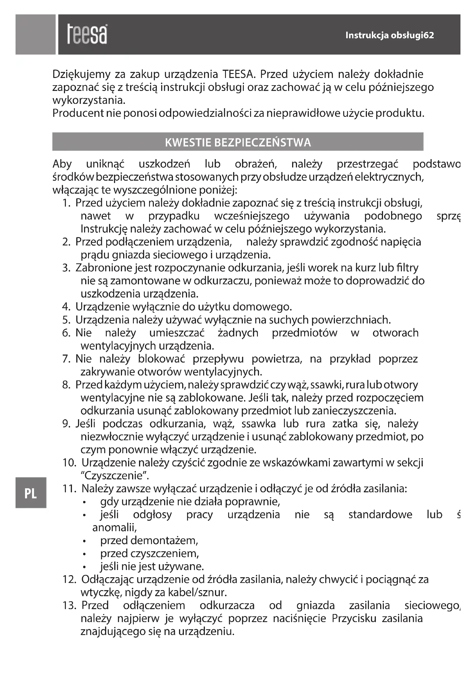 Dziękujemy za zakup urządzenia TEESA. Przed użyciem należy dokładnie zapoznaćsięztreściąinstrukcjiobsługiorazzachowaćjąwcelupóźniejszego wykorzystania. Producent nie ponosi odpowiedzialności za nieprawidłowe użycie produktu. Aby uniknąć uszkodzeń lub obrażeń, należy przestrzegać podstawowych środków bezpieczeństwa stosowanych przy obsłudze urządzeń elektrycznych, włączająctewyszczególnioneponiżej: