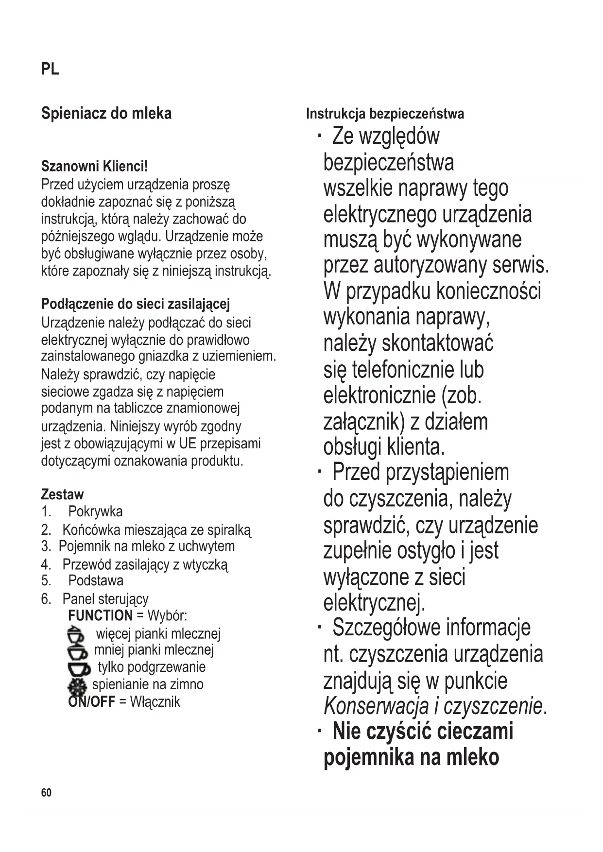 FUNCTION = Wybór: więcejpiankimlecznej mniej pianki mlecznej tylko podgrzewanie spienianie na zimno ON/OFF=Włącznik Instrukcja bezpieczeństwa ∙ Zewzględów bezpieczeństwa wszelkie naprawy tego elektrycznegourządzenia musząbyćwykonywane przez autoryzowany serwis. Wprzypadkukonieczności wykonania naprawy, należyskontaktować siętelefonicznielub elektronicznie (zob. załącznik)zdziałem obsługiklienta. ∙ Przedprzystąpieniem doczyszczenia,należy sprawdzić,czyurządzenie zupełnieostygłoijest wyłączonezsieci elektrycznej. ∙ Szczegółoweinformacje nt.czyszczeniaurządzenia znajdująsięwpunkcie Konserwacja i czyszczenie. ∙ Nie czyścić cieczami pojemnika na mleko PL104 x 142 mm