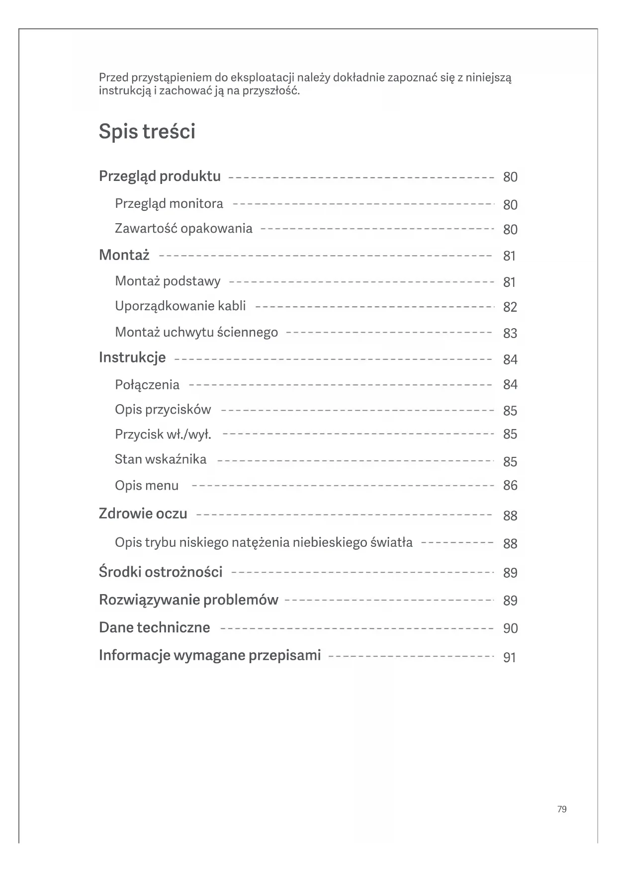 Przegląd produktu Przegląd monitora Zawartość opakowania Montaż Montaż podstawy Uporządkowanie kabli Montaż uchwytu ściennego Instrukcje Połączenia Opis przycisków Przycisk wł./wył. Stan wskaźnika Opis menu Środki ostrożności Rozwiązywanie problemów