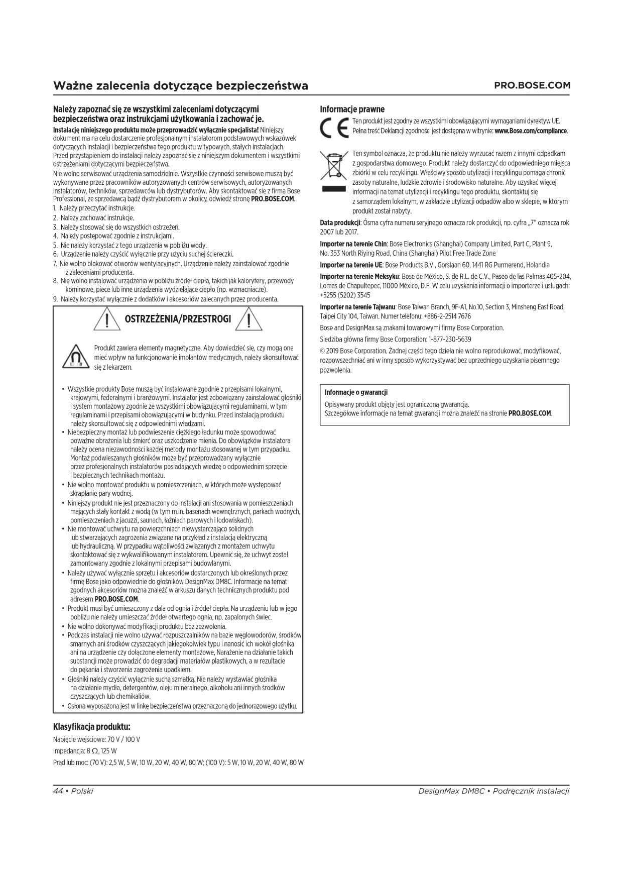 Klasyfikacja produktu: Napięcie wejściowe: 70V / 100V Impedancja: 8 Ω, 125 W Prąd lub moc: (70V): 2,5W, 5W, 10W, 20W, 40W, 80W; (100V): 5W, 10W, 20W, 40W, 80W Informacje prawne Ten produkt jest zgodny zewszystkimi obowiązującymi wymaganiami dyrektyw UE. Pełna treść Deklaracji zgodności jest dostępna wwitrynie: www.Bose.com/compliance. Ten symbol oznacza, że produktu nie należy wyrzucać razem zinnymi odpadkami zgospodarstwa domowego. Produkt należy dostarczyć do odpowiedniego miejsca zbiórki wcelu recyklingu. Właściwy sposób utylizacji irecyklingu pomaga chronić zasoby naturalne, ludzkie zdrowie iśrodowisko naturalne. Aby uzyskać więcej informacji na temat utylizacji irecyklingu tego produktu, skontaktuj się zsamorządem lokalnym, wzakładzie utylizacji odpadów albo wsklepie, wktórym produkt został nabyty. Data produkcji: Ósma cyfra numeru seryjnego oznacza rok produkcji, np. cyfra „7” oznacza rok 2007 lub 2017. Importer na terenie Chin: Bose Electronics (Shanghai) Company Limited, Part C, Plant 9, No. 353 North Riying Road, China (Shanghai) Pilot Free Trade Zone Importer na terenie UE: Bose Products B.V., Gorslaan 60, 1441 RG Purmerend, Holandia Importer na terenie Meksyku: Bose de México, S. de R.L. de C.V., Paseo de las Palmas 405-204, Lomas de Chapultepec, 11000 México, D.F. W celu uzyskania informacji oimporterze iusługach: +5255 (5202) 3545 Importer na terenie Tajwanu: Bose Taiwan Branch, 9F-A1, No.10, Section 3, Minsheng East Road, Taipei City 104, Taiwan. Numer telefonu: +886-2-2514 7676 Bose and DesignMax są znakami towarowymi firmy Bose Corporation. Siedziba główna firmy Bose Corporation: 1-877-230-5639 © 2019 Bose Corporation. Żadnej części tego dzieła nie wolno reprodukować, modyfikować, rozpowszechniać ani winny sposób wykorzystywać bez uprzedniego uzyskania pisemnego pozwolenia. Informacje ogwarancji Opisywany produkt objęty jest ograniczoną gwarancją. Szczegółowe informacje na temat gwarancji można znaleźć na stronie PRO.BOSE.COM.