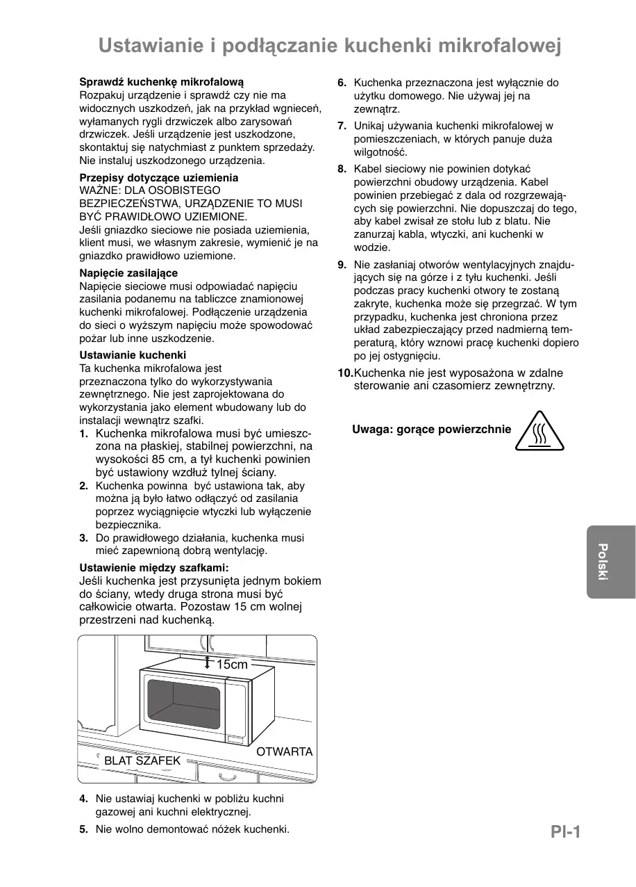Pl-1 Ustawianie i podłączanie kuchenki mikrofalowej OSTRZEŻENIE