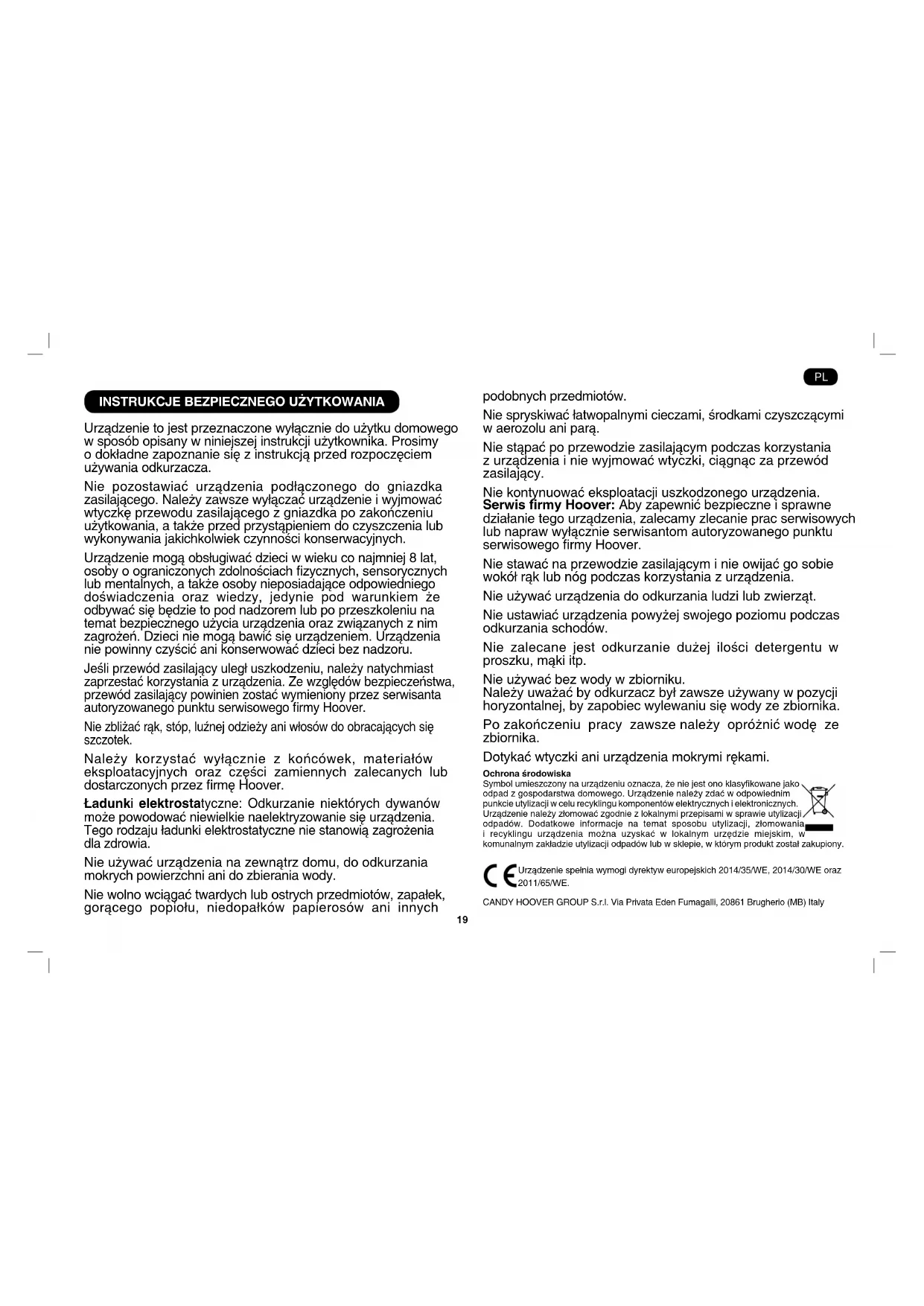 Urządzenie to jest przeznaczone wyłącznie do użytku domowego w sposób opisany w niniejszej instrukcji użytkownika. Prosimy o dokładne zapoznanie się z instrukcją przed rozpoczęciem używania odkurzacza. Nie pozostawiać urządzenia podłączonego do gniazdka zasilającego. Należy zawsze wyłączać urządzenie i wyjmować wtyczkę przewodu zasilającego z gniazdka po zakończeniu użytkowania, a także przed przystąpieniem do czyszczenia lub wykonywania jakichkolwiek czynności konserwacyjnych. Urządzenie mogą obsługiwać dzieci w wieku co najmniej 8 lat, osoby o ograniczonych zdolnościach zycznych, sensorycznych lub mentalnych, a także osoby nieposiadające odpowiedniego doświadczenia oraz wiedzy, jedynie pod warunkiem że odbywać się będzie to pod nadzorem lub po przeszkoleniu na temat bezpiecznego użycia urządzenia oraz związanych z nim zagrożeń. Dzieci nie mogą bawić się urządzeniem. Urządzenia nie powinny czyścić ani konserwować dzieci bez nadzoru. Jeśli przewód zasilający uległ uszkodzeniu, należy natychmiast zaprzestać korzystania z urządzenia. Ze względów bezpieczeństwa, przewód zasilający powinien zostać wymieniony przez serwisanta autoryzowanego punktu serwisowego rmy Hoover. Nie zbliżać rąk, stóp, luźnej odzieży ani włosów do obracających się szczotek. Należy korzystać wyłącznie z końcówek, materiałów eksploatacyjnych oraz części zamiennych zalecanych lub dostarczonych przez rmę Hoover. Ładunki elektrostatyczne: Odkurzanie niektórych dywanów może powodować niewielkie naelektryzowanie się urządzenia. Tego rodzaju ładunki elektrostatyczne nie stanowią zagrożenia dla zdrowia. Nie używać urządzenia na zewnątrz domu, do odkurzania mokrych powierzchni ani do zbierania wody. Nie wolno wciągać twardych lub ostrych przedmiotów, zapałek, gorącego popiołu, niedopałków papierosów ani innych podobnych przedmiotów. Nie spryskiwać łatwopalnymi cieczami, środkami czyszczącymi w aerozolu ani parą. Nie stąpać po przewodzie zasilającym podczas korzystania z urządzenia i nie wyjmować wtyczki, ciągnąc za przewód zasilający. Nie kontynuować eksploatacji uszkodzonego urządzenia. Serwis rmy Hoover: Aby zapewnić bezpieczne i sprawne działanie tego urządzenia, zalecamy zlecanie prac serwisowych lub napraw wyłącznie serwisantom autoryzowanego punktu serwisowego rmy Hoover. Nie stawać na przewodzie zasilającym i nie owijać go sobie wokół rąk lub nóg podczas korzystania z urządzenia. Nie używać urządzenia do odkurzania ludzi lub zwierząt. Nie ustawiać urządzenia powyżej swojego poziomu podczas odkurzania schodów. Nie zalecane jest odkurzanie dużej ilości detergentu w proszku, mąki itp. Nie używać bez wody w zbiorniku. Należy uważać by odkurzacz był zawsze używany w pozycji horyzontalnej, by zapobiec wylewaniu się wody ze zbiornika. Po zakończeniu pracy zawsze należy opróżnić wodę ze zbiornika. Dotykać wtyczki ani urządzenia mokrymi rękami. Ochrona środowiska Symbol umieszczony na urządzeniu oznacza, że nie jest ono klasykowane jako odpad z gospodarstwa domowego. Urządzenie należy zdać w odpowiednim punkcie utylizacji w celu recyklingu komponentów elektrycznych i elektronicznych. Urządzenie należy złomować zgodnie z lokalnymi przepisami w sprawie utylizacji odpadów. Dodatkowe informacje na temat sposobu utylizacji, złomowania i recyklingu urządzenia można uzyskać w lokalnym urzędzie miejskim, w komunalnym zakładzie utylizacji odpadów lub w sklepie, w którym produkt został zakupiony. Urządzenie spełnia wymogi dyrektyw europejskich 2014/35/WE, 2014/30/WE oraz 2011/65/WE. CANDY HOOVER GROUP S.r.l. Via Privata Eden Fumagalli, 20861 Brugherio (MB) Italy PL20 *Tylko w niektórych modelach **W zależności od modelu. ELEMENTY ODKURZACZA