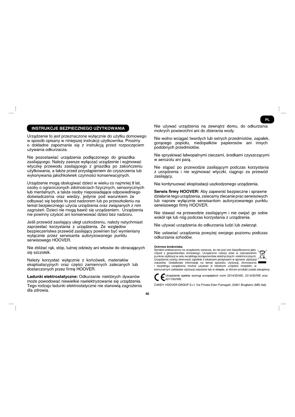 Urządzenie to jest przeznaczone wyłącznie do użytku domowego w sposób opisany w niniejszej instrukcji użytkownika. Prosimy o dokładne zapoznanie się z instrukcją przed rozpoczęciem używania odkurzacza. Nie pozostawiać urządzenia podłączonego do gniazdka zasilającego. Należy zawsze wyłączać urządzenie i wyjmować wtyczkę przewodu zasilającego z gniazdka po zakończeniu użytkowania, a także przed przystąpieniem do czyszczenia lub wykonywania jakichkolwiek czynności konserwacyjnych. Urządzenie mogą obsługiwać dzieci w wieku co najmniej 8 lat, osoby o ograniczonych zdolnościach zycznych, sensorycznych lub mentalnych, a także osoby nieposiadające odpowiedniego doświadczenia oraz wiedzy, jedynie pod warunkiem że odbywać się będzie to pod nadzorem lub po przeszkoleniu na temat bezpiecznego użycia urządzenia oraz związanych z nim zagrożeń. Dzieci nie mogą bawić się urządzeniem. Urządzenia nie powinny czyścić ani konserwować dzieci bez nadzoru. Jeśli przewód zasilający uległ uszkodzeniu, należy natychmiast zaprzestać korzystania z urządzenia. Ze względów bezpieczeństwa przewód zasilający powinien być wymieniany wyłącznie przez serwisanta autoryzowanego punktu serwisowego HOOVER. Nie zbliżać rąk, stóp, luźnej odzieży ani włosów do obracających się szczotek. Należy korzystać wyłącznie z końcówek, materiałów eksploatacyjnych oraz części zamiennych zalecanych lub dostarczonych przez rmę HOOVER. Ładunki elektrostatyczne: Odkurzanie niektórych dywanów może powodować niewielkie naelektryzowanie się urządzenia. Tego rodzaju ładunki elektrostatyczne nie stanowią zagrożenia dla zdrowia. Nie używać urządzenia na zewnątrz domu, do odkurzania mokrych powierzchni ani do zbierania wody. Nie wolno wciągać twardych lub ostrych przedmiotów, zapałek, gorącego popiołu, niedopałków papierosów ani innych podobnych przedmiotów. Nie spryskiwać łatwopalnymi cieczami, środkami czyszczącymi w aerozolu ani parą. Nie stąpać po przewodzie zasilającym podczas korzystania z urządzenia i nie wyjmować wtyczki, ciągnąc za przewód zasilający. Nie kontynuować eksploatacji uszkodzonego urządzenia. Serwis rmy HOOVER: Aby zapewnić bezpieczne i sprawne działanie tego urządzenia, zalecamy zlecanie prac serwisowych lub napraw wyłącznie serwisantom autoryzowanego punktu serwisowego rmy HOOVER. Nie stawać na przewodzie zasilającym i nie owijać go sobie wokół rąk lub nóg podczas korzystania z urządzenia. Nie używać urządzenia do odkurzania ludzi lub zwierząt. Nie ustawiać urządzenia powyżej swojego poziomu podczas odkurzania schodów. Ochrona środowiska Symbol umieszczony na urządzeniu oznacza, że nie jest ono klasykowane jako odpad z gospodarstwa domowego. Urządzenie należy zdać w odpowiednim punkcie utylizacji w celu recyklingu komponentów elektrycznych i elektronicznych. Urządzenie należy złomować zgodnie z lokalnymi przepisami w sprawie utylizacji odpadów. Dodatkowe informacje na temat sposobu utylizacji, złomowania i recyklingu urządzenia można uzyskać w lokalnym urzędzie miejskim, w komunalnym zakładzie utylizacji odpadów lub w sklepie, w którym produkt został zakupiony. Urządzenie spełnia wymogi europejskich norm 2014/35/WE, 2014/30/WE oraz 2011/65/WE. CANDY HOOVER GROUP S.r.l. Via Privata Eden Fumagalli, 20861 Brugherio (MB) Italy PLMONTAŻ ODKURZACZA Wyjmij wszystkie elementy z opakowania.