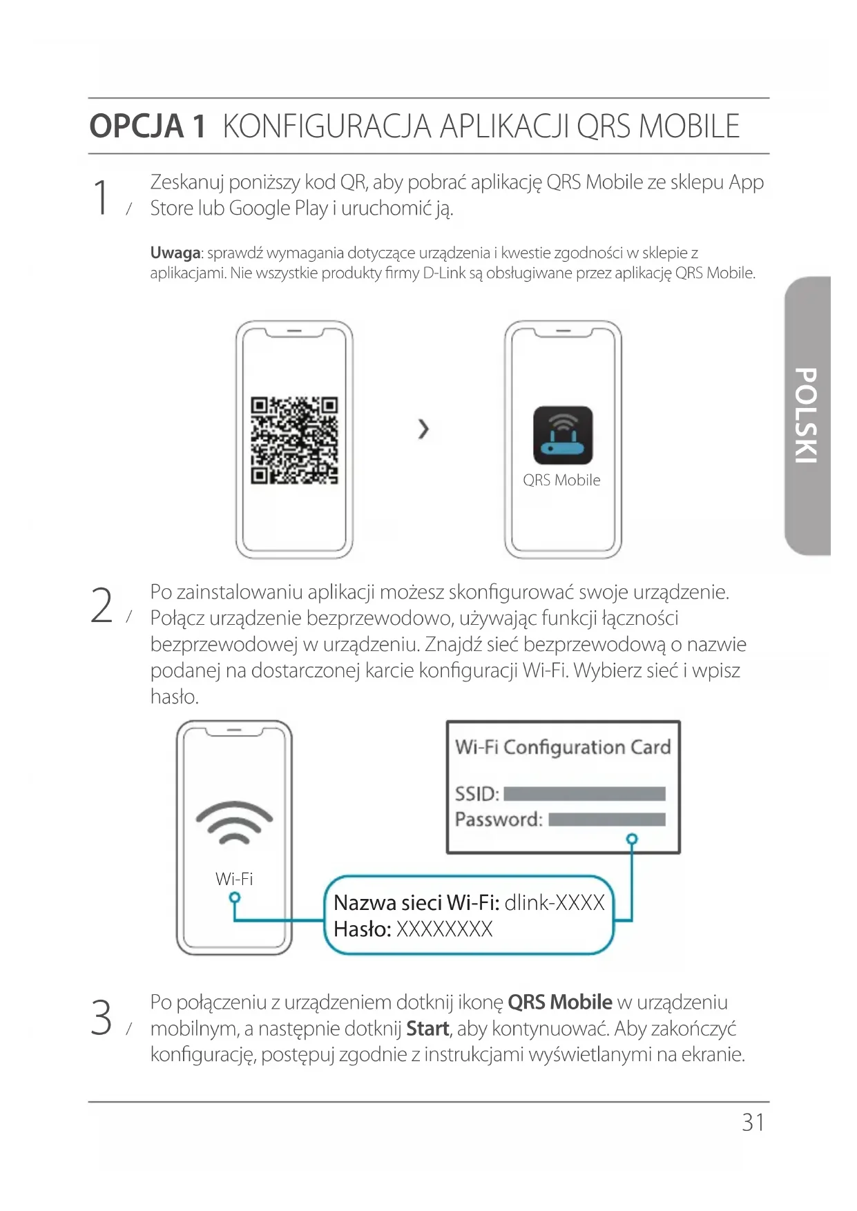 Zeskanuj poniższy kod QR, aby pobrać aplikację QRS Mobile ze sklepu App Store lub Google Play i uruchomić ją. Uwaga: sprawdź wymagania dotyczące urządzenia i kwestie zgodności w sklepie z aplikacjami. Nie wszystkie produkty firmy D-Link są obsługiwane przez aplikację QRS Mobile. 1 / QRS MobilePo zainstalowaniu aplikacji możesz skonfigurować swoje urządzenie. Połącz urządzenie bezprzewodowo, używając funkcji łączności bezprzewodowej w urządzeniu. Znajdź sieć bezprzewodową o nazwie podanej na dostarczonej karcie konfiguracji Wi-Fi. Wybierz sieć i wpisz hasło. 2 / Wi-Fi Nazwa sieci Wi-Fi: dlink-XXXX Hasło: XXXXXXXX Po połączeniu z urządzeniem dotknij ikonę QRS Mobile w urządzeniu mobilnym, a następnie dotknij Start, aby kontynuować. Aby zakończyć konfigurację, postępuj zgodnie z instrukcjami wyświetlanymi na ekranie. 3 /32 POLSKI