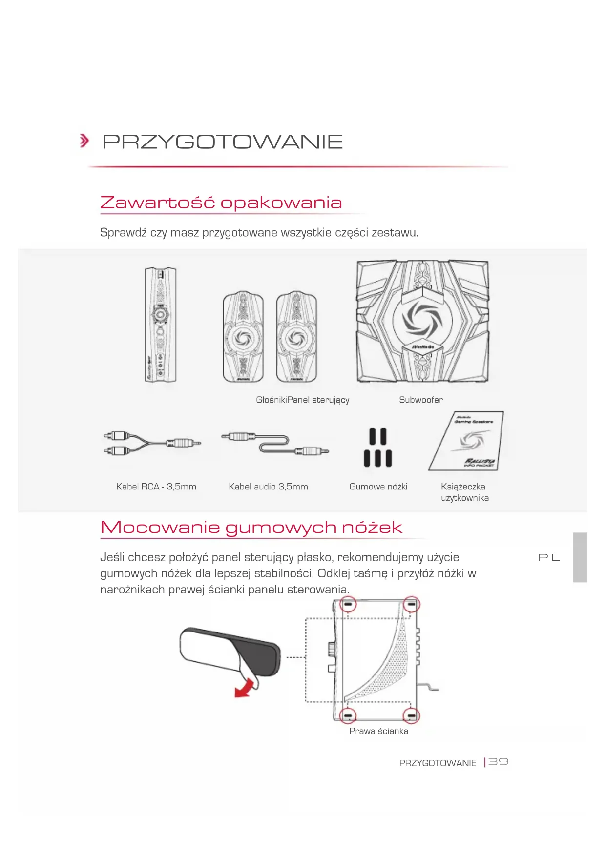 (Опционально) Задняя панель Передняя панель39 PRZYGOTOWANIE PRZYGOTOWANIE Zawartość opakowania Sprawdź czy masz przygotowane wszystkie części zestawu. Subwoofer Kabel RCA - 3,5mm Mocowanie gumowych nóżek Jeśli chcesz położyć panel sterujący płasko, rekomendujemy użycie gumowych nóżek dla lepszej stabilności. Odklej taśmę i przyłóż nóżki w narożnikach prawej ścianki panelu sterowania. Książeczka użytkownika GłośnikiPanel sterujący Kabel audio 3,5mm Prawa ścianka Gumowe nóżki PL40 PRZYGOTOWANIE Przegląd panelu sterującego 1 Wskaźnik zasilania 8 Lewe wejście audio 2 Zasilania/Regulator głośności 9 Prawe wejście audio 3 Regulator tonów niskich 10 Lewe wyjście audio 4 Wyjście na słuchawki 11 Prawe wyjście audio 5 Wejście na mikrofon 12 Wyjście na subwoofer 6 Wejście liniowe 13 Włącznik zasilania 7 Wyjście na mikrofon 14 Wejście na zasilanie